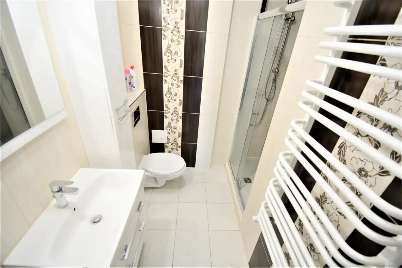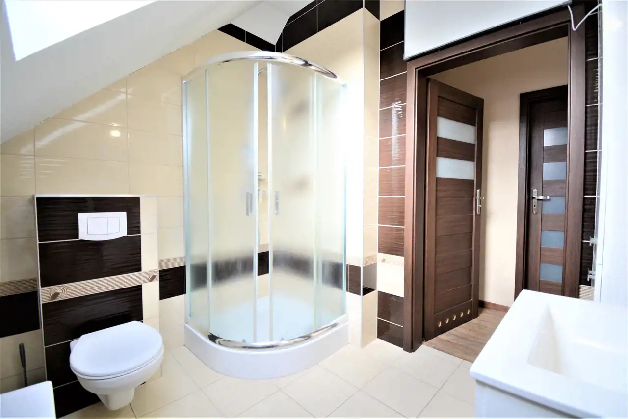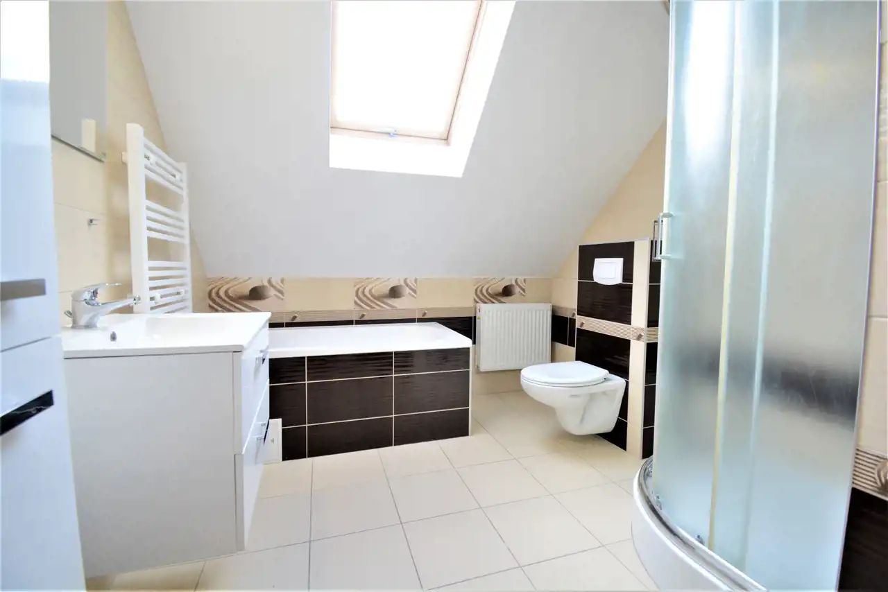 Duża łazienka z wc, wanną i kabiną prysznicową