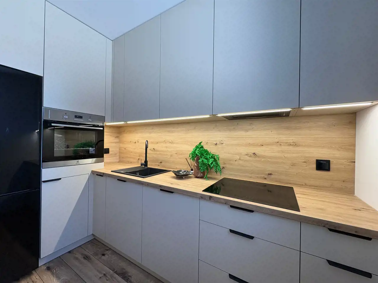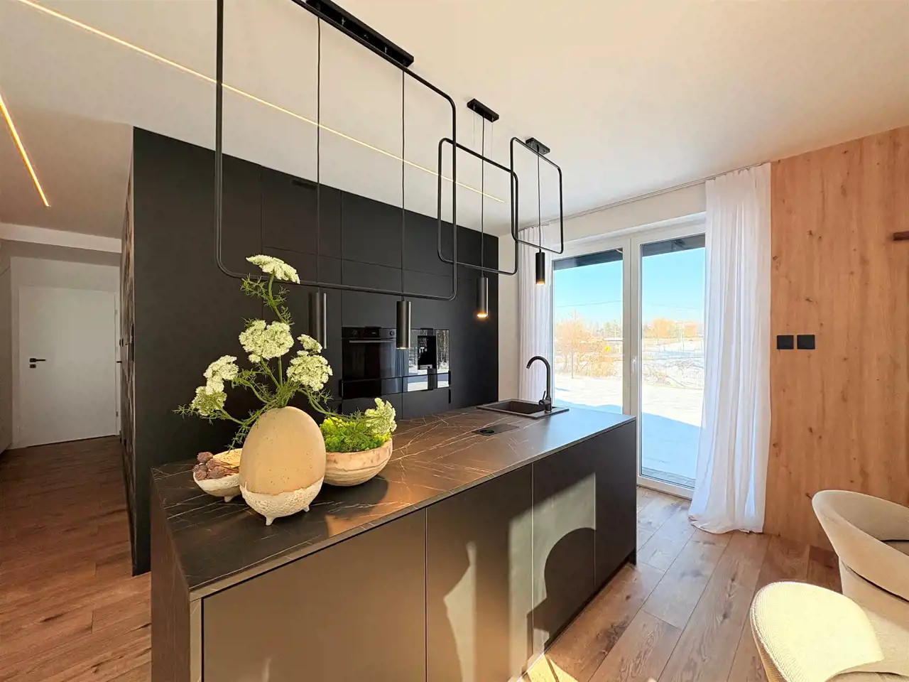 Kuchnia została zaprojektowana z myślą o maksymalnym komforcie – otwarta na jadalnię i salon, z ukrytymi drzwiami prowadzącymi do tzw. „brudnej kuchni”. Dzięki temu część reprezentacyjna zawsze pozostaje idealnie uporządkowana.