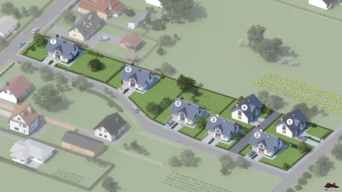 Każdy budynek posiada osobny wjazd na prywatną działkę o powierzchni od 3,7 do 8,8 arów. Spokojna okolica zapewni mieszkańcom ciszę i prywatność.