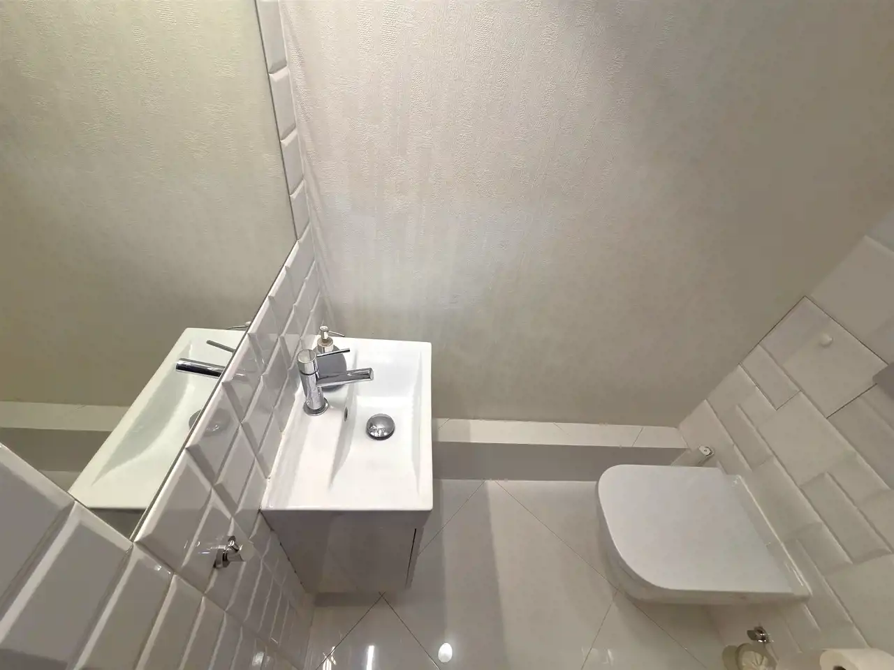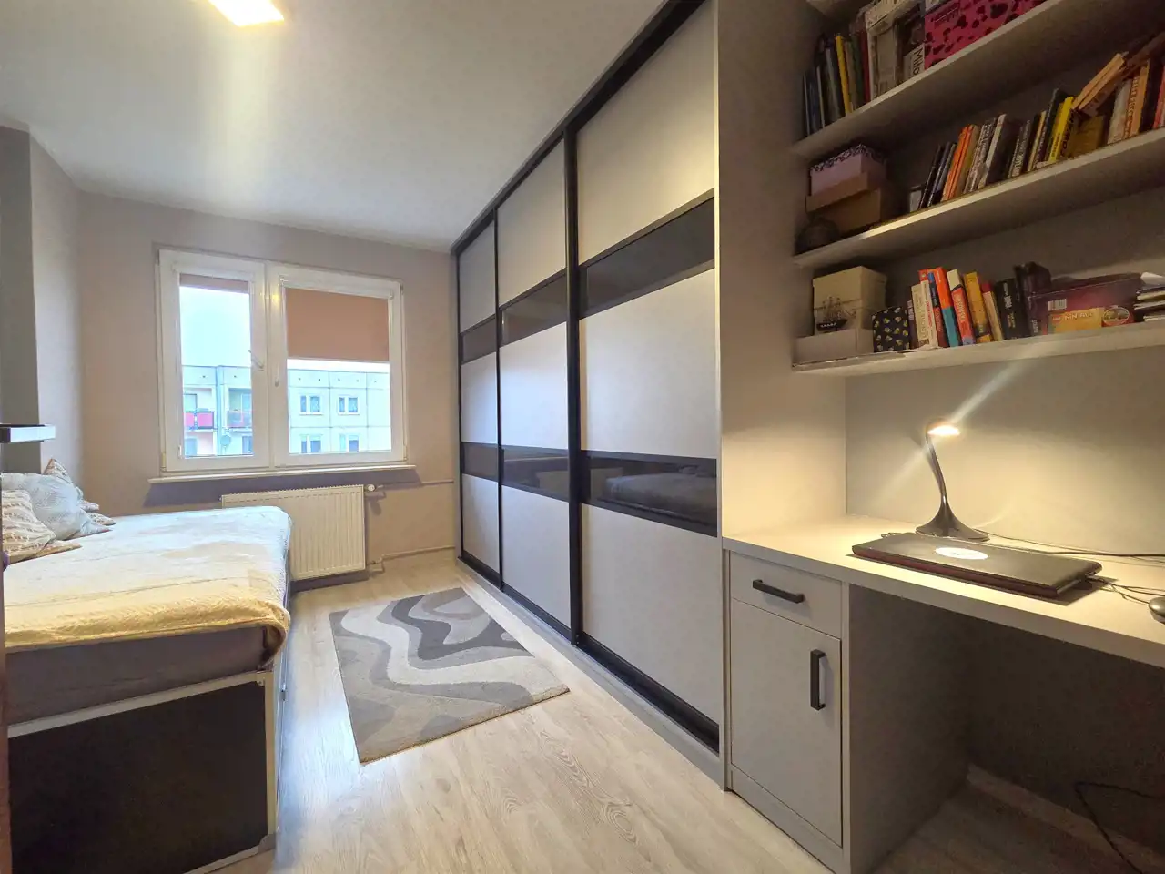 Z korytarza wchodzimy do wszystkich pomieszczeń, przy drzwiach wejściowych szafa garderobiana z drzwiami suwanymi, osobno wc z umywalką i łazienka z kabiną prysznicową, wyposażona w pralkę.
