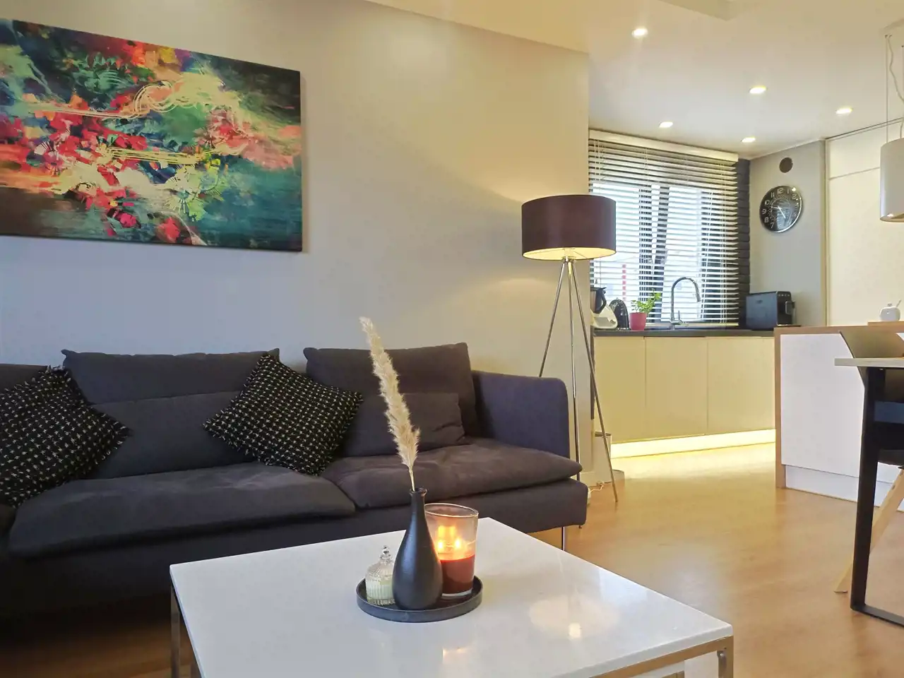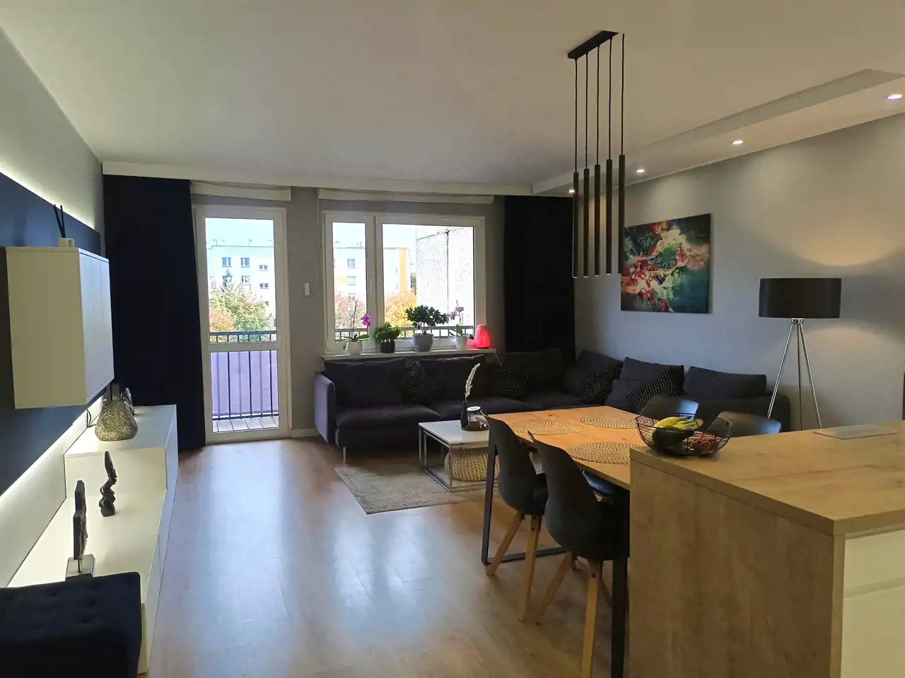 • Z salonu prowadzi wyjście na duży balkon, gdzie można cieszyć się poranną kawą lub popołudniowym odpoczynkiem.
