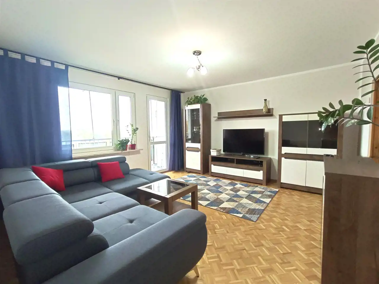 Przestronny salon z wyjściem na duży balkon oraz dwie oddzielne sypialnie.