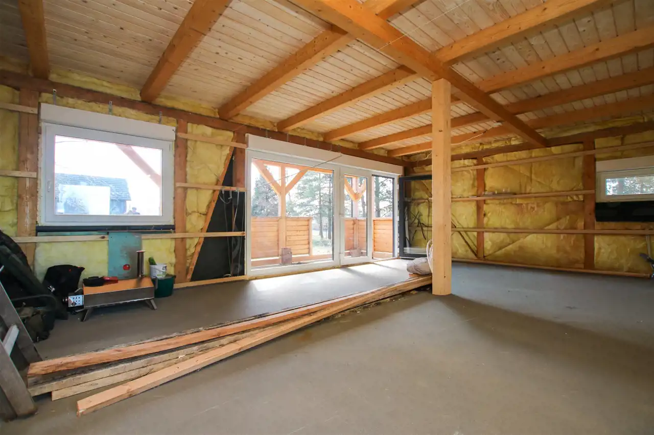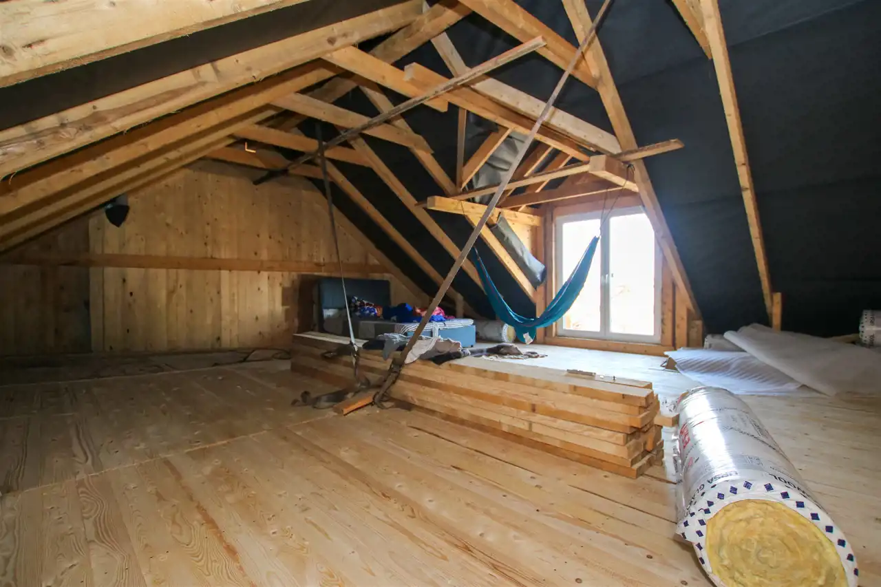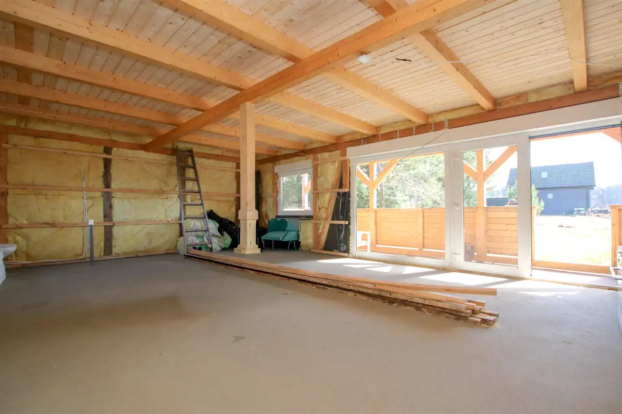 - otwarta przestrzeń do adaptacji – możliwość wydzielenia sypialni, gabinetu i łazienki a także strefy relaksu, estetyczne wykończenie w drewnie,