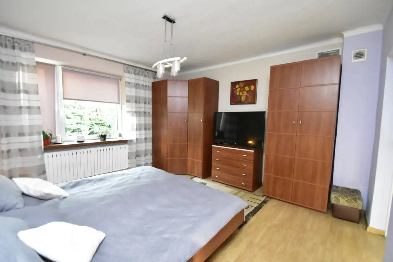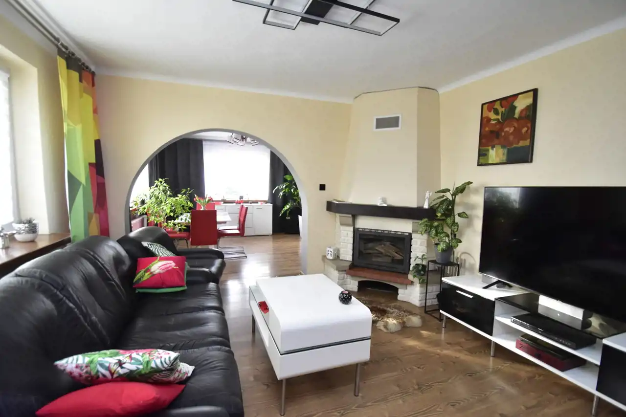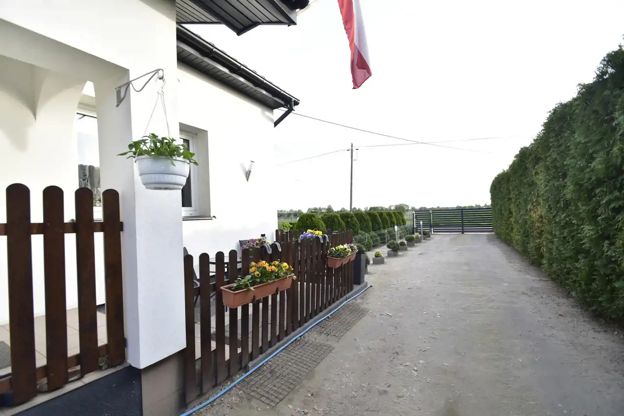 Pokoje wykończone panelami, kuchnia i łazienki płytkami. Okna PCV. Centralne ogrzewanie zasilane przez pompę ciepła. Bojler elektryczny do podgrzewania wody. Elektryka miedziana. Fotowoltaika 10 kw na dachu garażu. Założony pełny monitoring posesji. W obrębie działki znajduje się duży budynek garażowy o powierzchni 100 m2 ze strychem użytkowym. Do budynku przynależy również letniak ( z kuchnią).