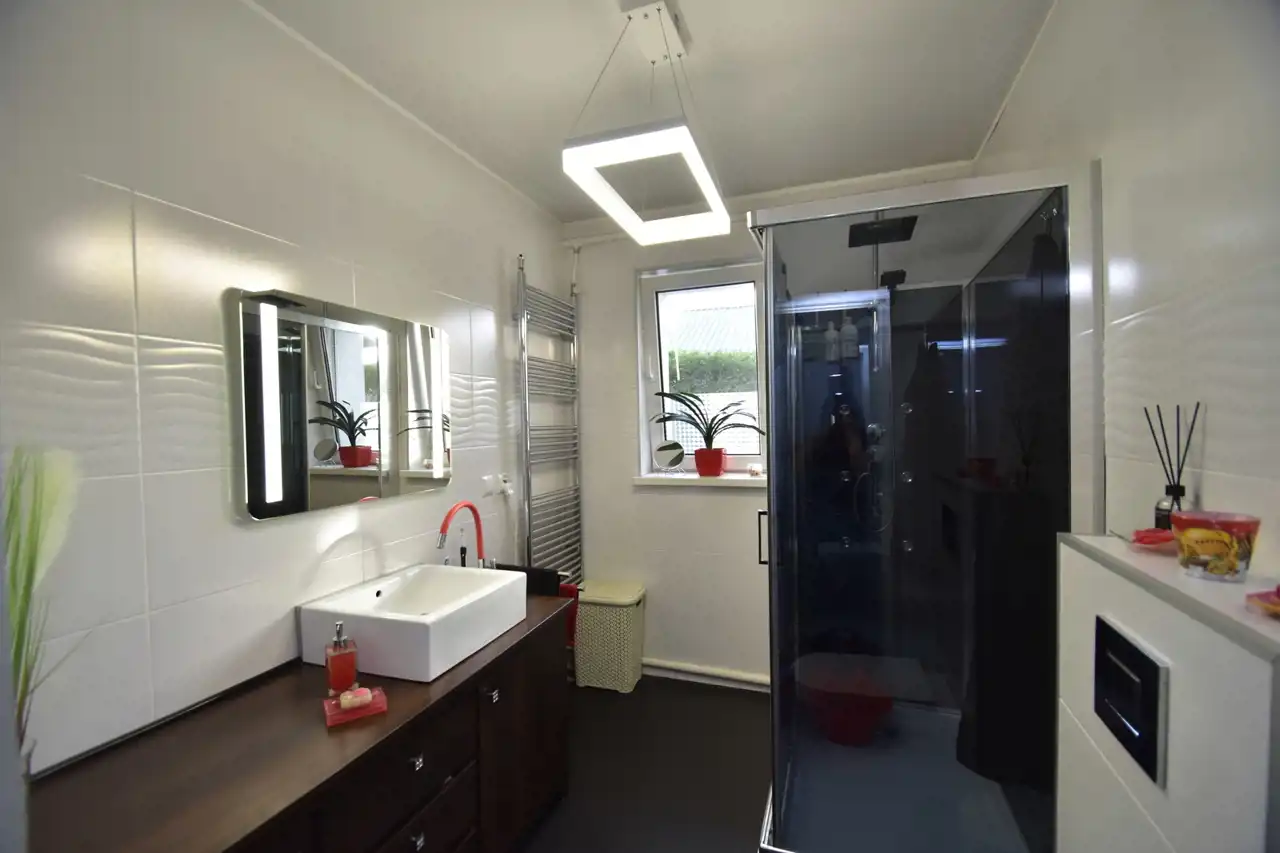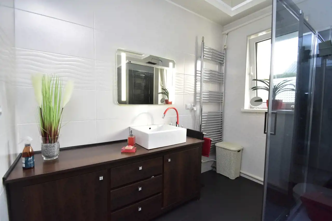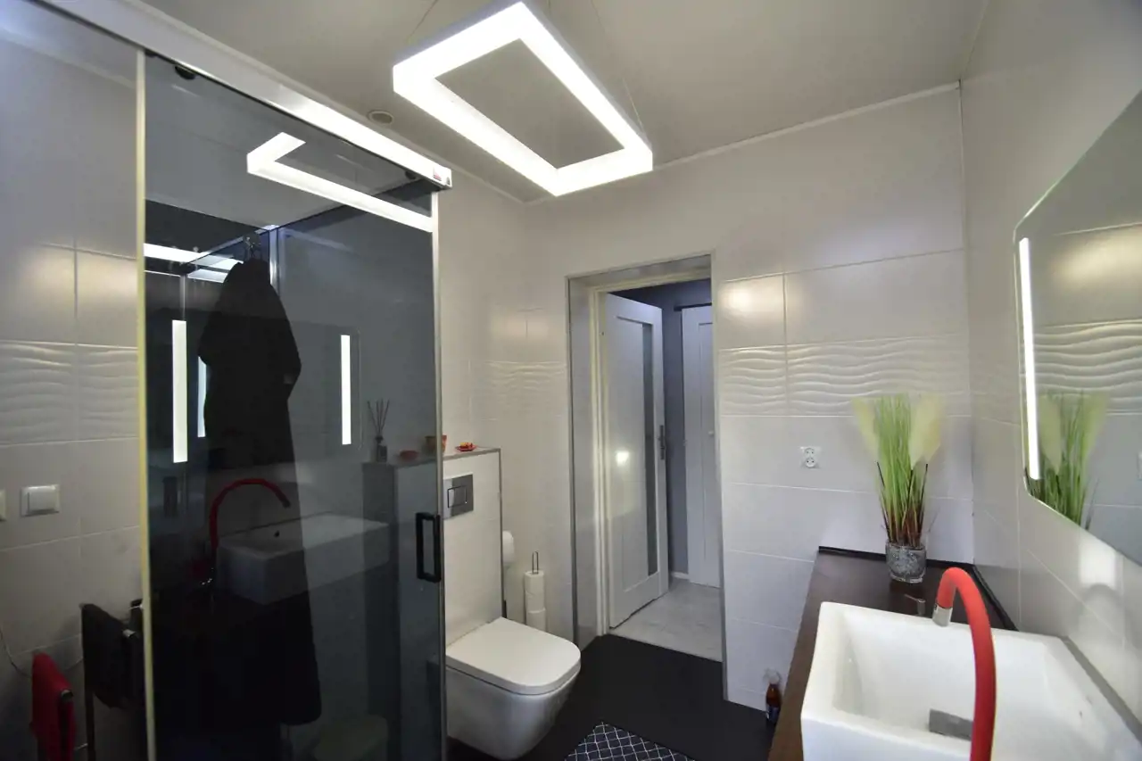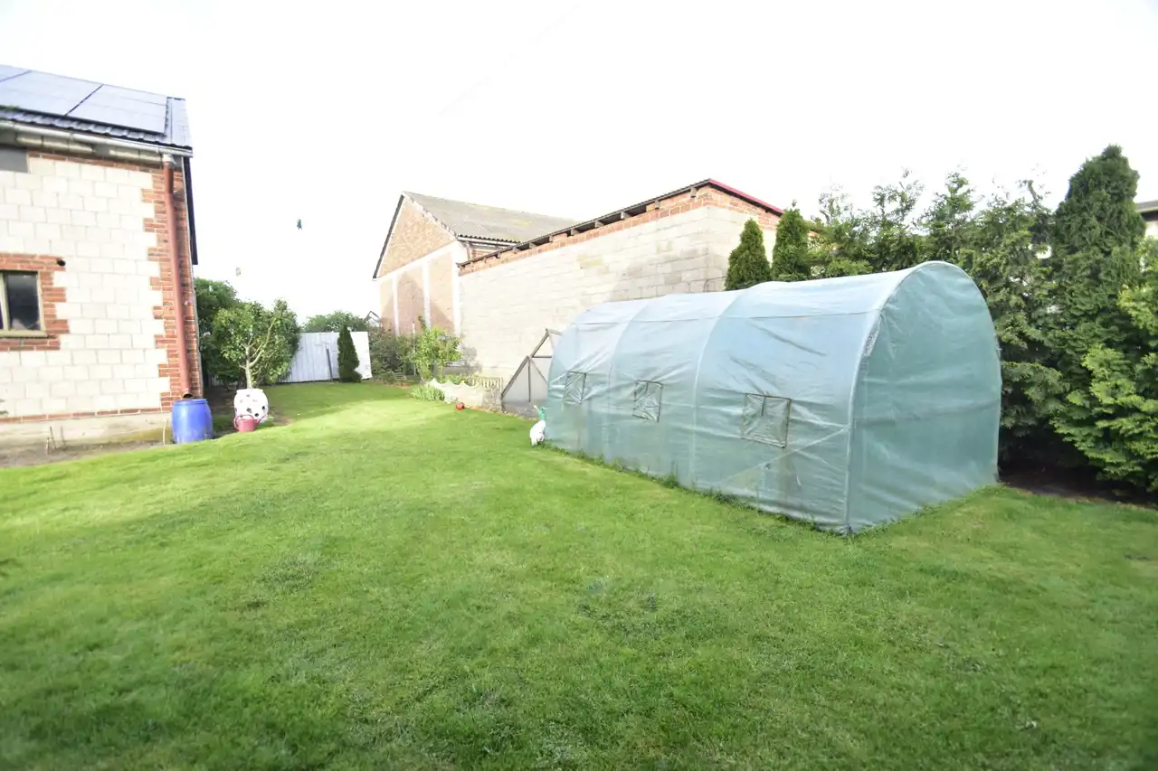 Pokoje wykończone panelami, kuchnia i łazienki płytkami. Okna PCV. Centralne ogrzewanie zasilane przez pompę ciepła. Bojler elektryczny do podgrzewania wody. Elektryka miedziana. Fotowoltaika 10 kw na dachu garażu. Założony pełny monitoring posesji. W obrębie działki znajduje się duży budynek garażowy o powierzchni 100 m2 ze strychem użytkowym. Do budynku przynależy również letniak ( z kuchnią).