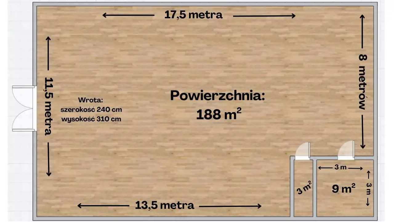 2) Hala o powierzchni 200 m2 - znajduję się w budynku wolnostojącym i posiada powierzchnię magazynową 188 m2 oraz dwa mniejsze pomieszczenia socjalno-biurowe o powierzchni 9 m2 i 3 m2. Hala posiada bramę wjazdową o szerokości 240 cm i wysokości na 310 cm. Wysokość hali w najwyższym punkcie to 5 metrów a w najniższym 4 metry.