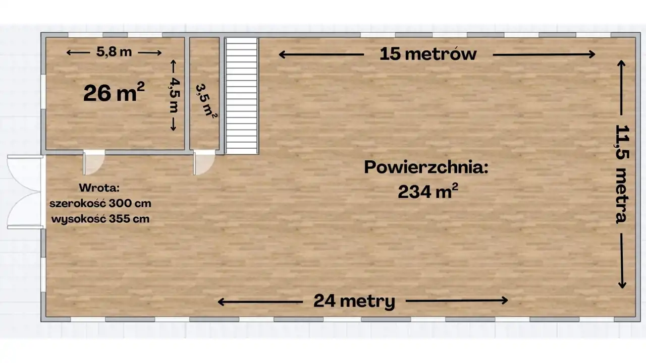 1) Hala o powierzchni 320 m2 - znajdują w budynku wolnostojącym, posiada powierzchnię magazynową 234 m2 oraz dwa pomieszczenia socjalno-biurowe o powierzchni 26 m2 i 3,5 m2. Nad nami znajduję również antresola, którą można zaadaptować na kolejne pomieszczenie biurowe o powierzchni 25 m2. Hala posiada bramę wjazdową o szerokości 300 cm i wysokości 355 cm.