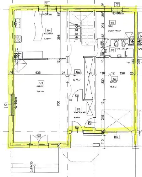 * PARTER: wiatrołap, korytarz, salon z wyjściem na taras i miejscem na kominek, połączony z kuchnią i jadalnią, łazienka w WC, kotłownia, pomieszczenie gospodarcze, garaż