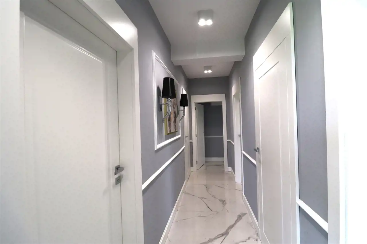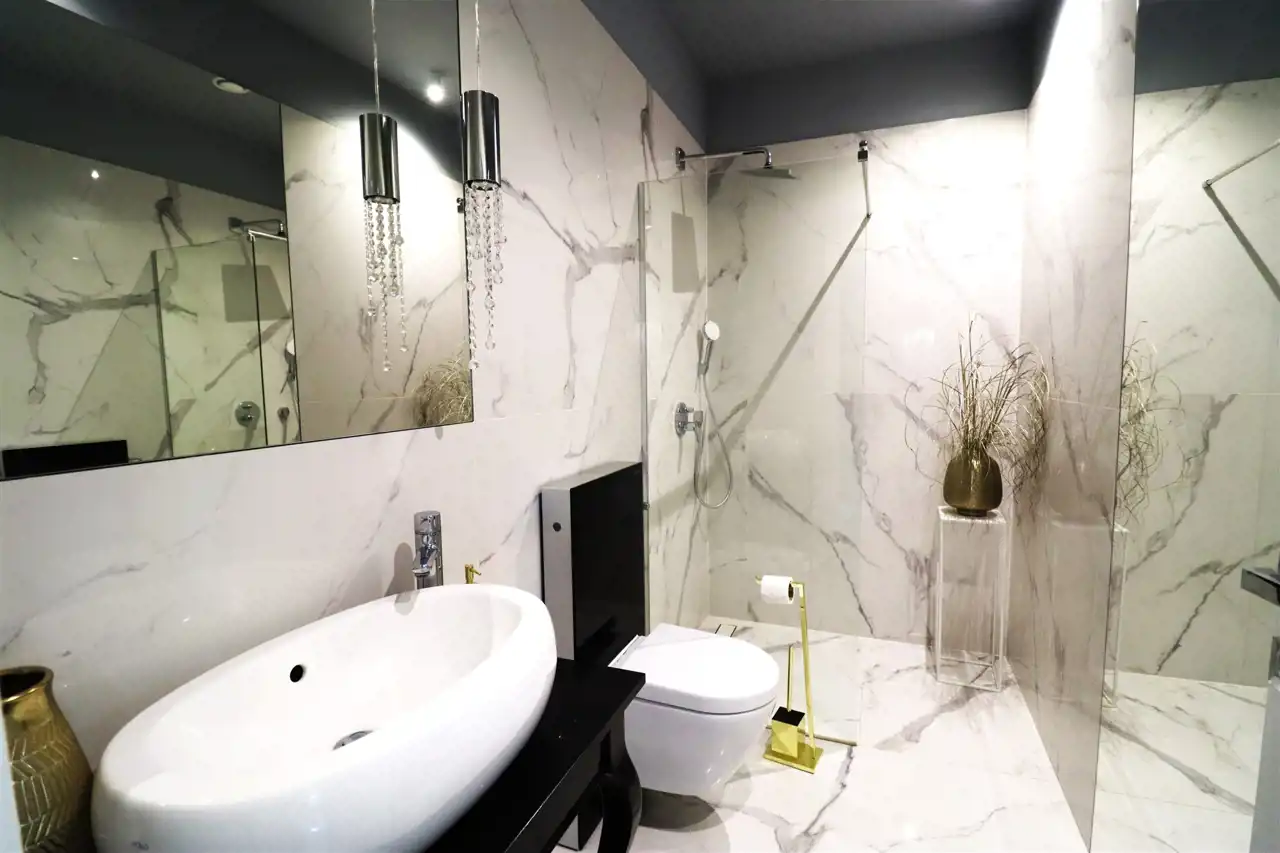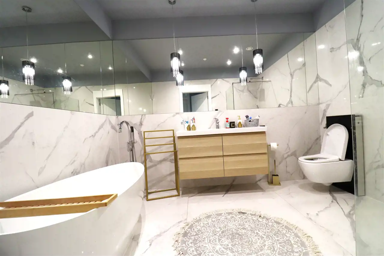 Wysoki standard pomieszczeń - materiały dobrej klasy i jakości : podłogi w sypialniach drewniane, w łazienkach i hallu płytki calacata 120x120. Wszystkie pomieszczenia wyposażone w kilka rodzajów dodatkowego oświetlenia.