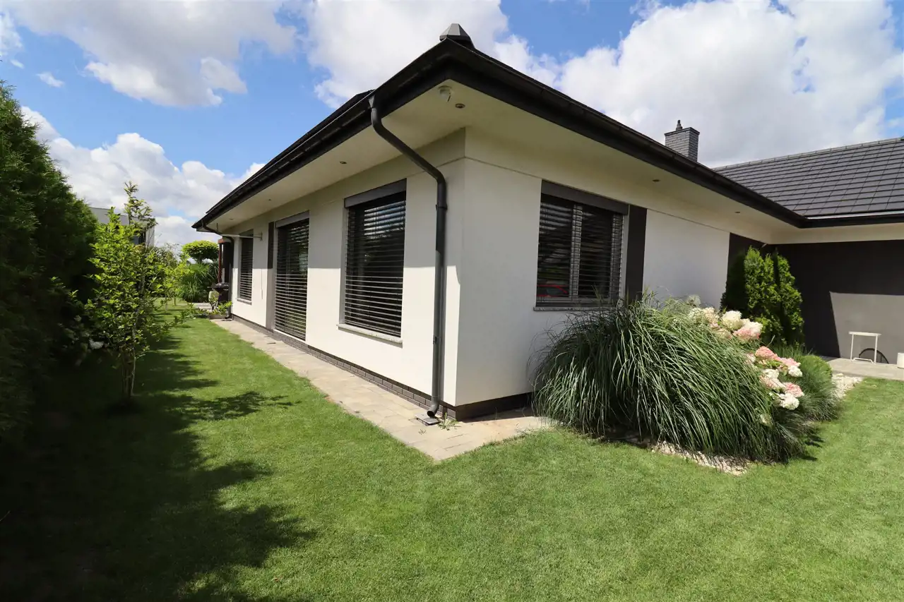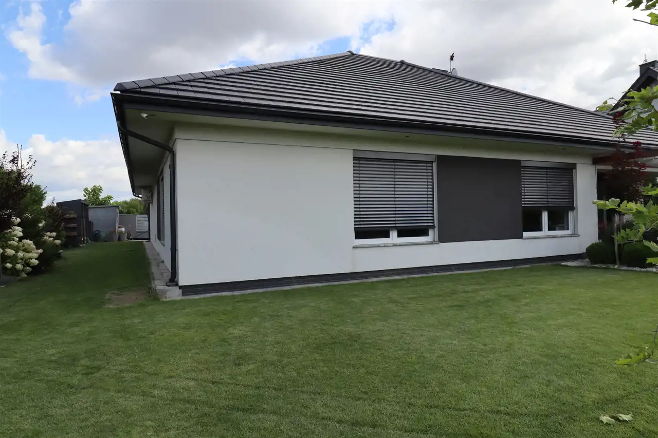 Nieruchomość stanowi dom parterowy, niepodpiwniczony, oddany do użytkowania w 2018 roku, docieplony termoorganiką grafitową, dach kryty dachówką ceramiczną płaską Braas. Posadowiony na płaskiej 10 arowej, ogrodzonej dzialce z automatyczną bramą wjazdową.