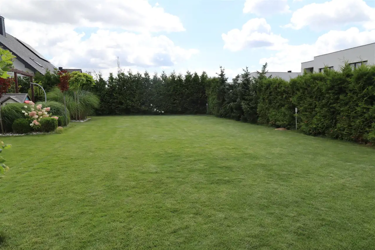 Na terenie działki znajduje się drewutnia, domek narzędziowy. Działka zagospodarowana z nasadzeniami roślin ozdobnych, trawa z rolki, automatyczne podlewanie, kosiarka automatyczna Husqvarna.