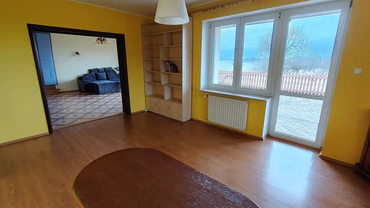 - salonu o powierzchni około 50m2, aktualnie składającego się dwóch pomieszczeń z szerokim przejściem, które w razie potrzeby można zamurować i wydzielić dwa niezależne pokoje (każde z wyjściem na częściowo zadaszony taras).