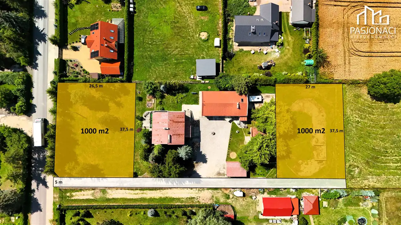 - Wymiary: ok. 37,5 m szerokości x 27 m długości - idealne proporcje pod zabudowę jednorodzinną