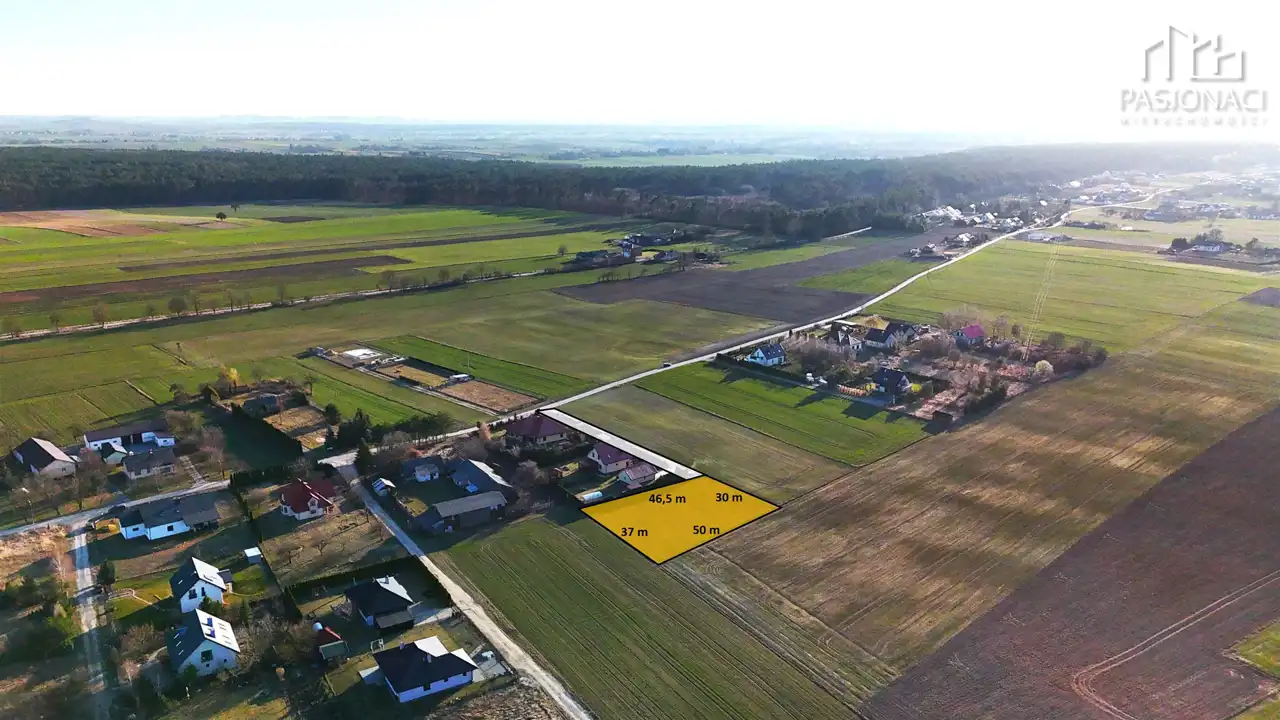 Wymiary: ok. 46,5 m x 30 m x 50 m x 37 m- działka w kształcie trapezu