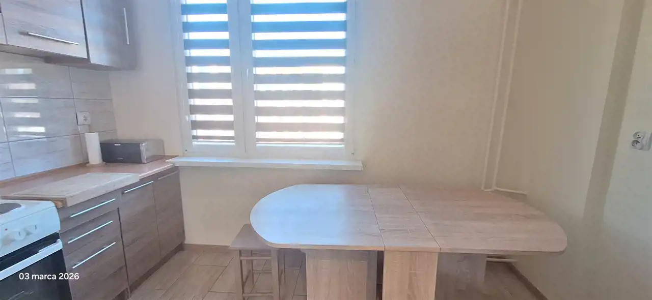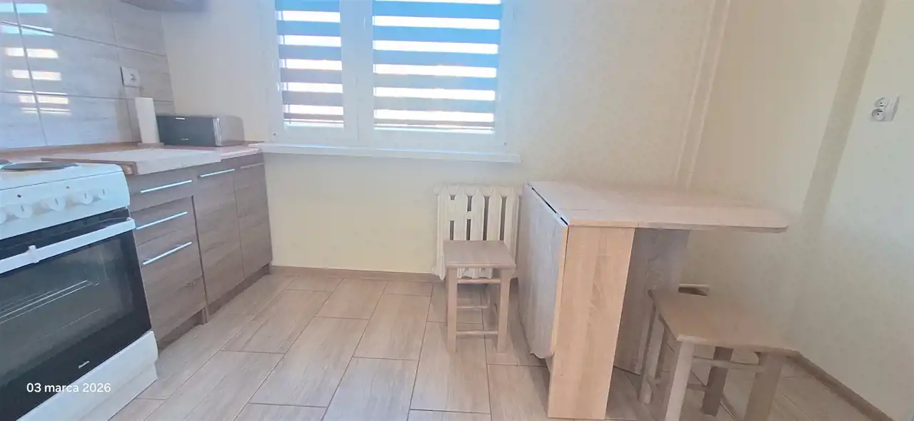 Osobna, widna kuchnia z niezbędnym sprzętem AGD, rozkładanym stołem.