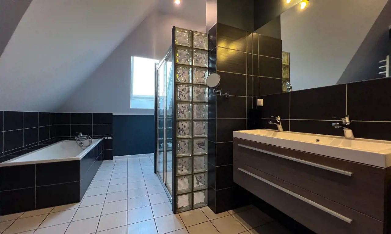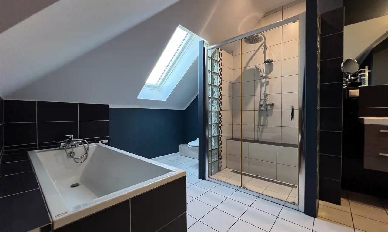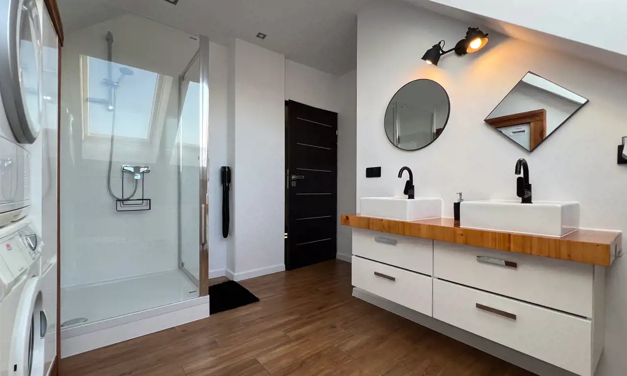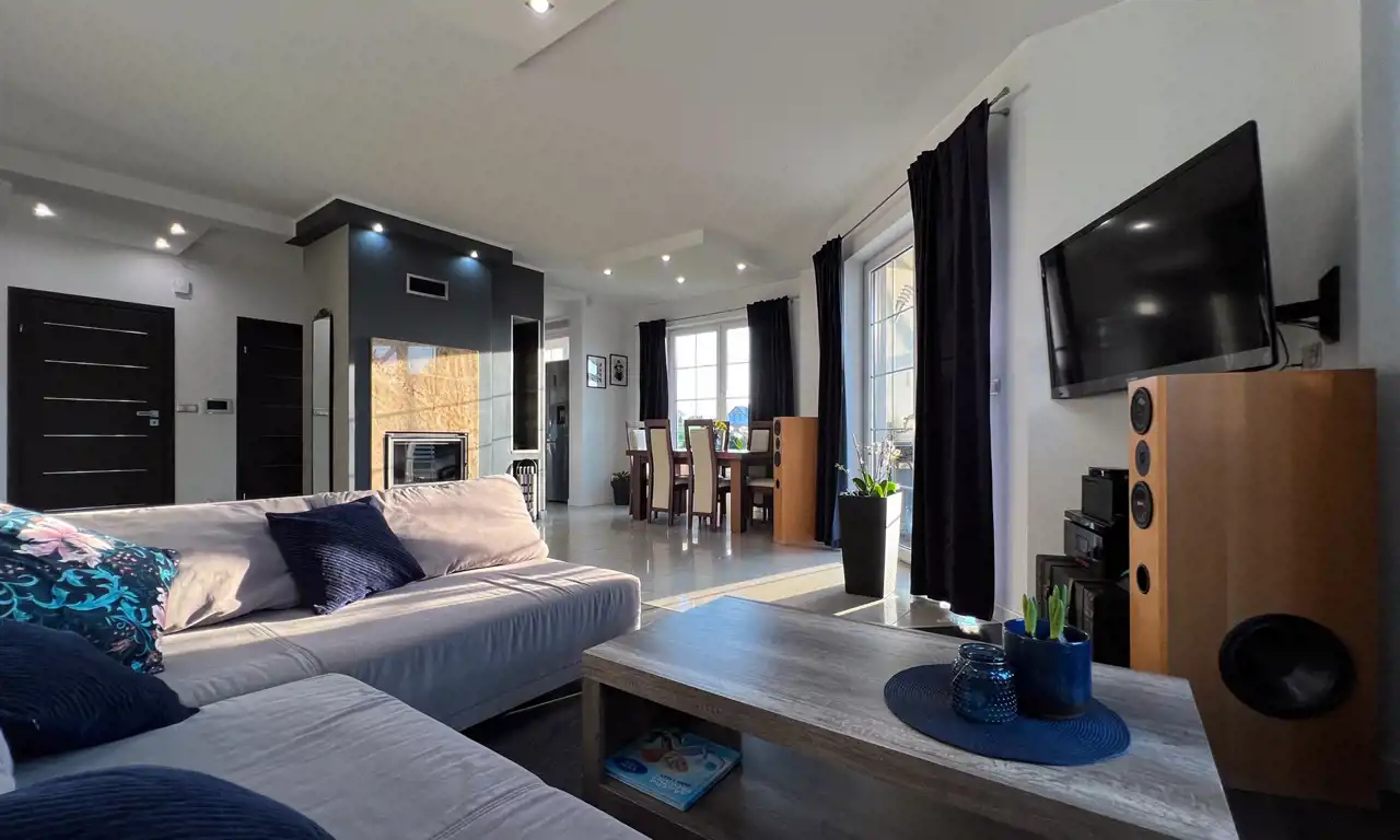 Nieruchomość została zaprojektowana z myślą o komfortowym funkcjonowaniu nawet 4-5 osób. Całkowita powierzchnia domu to 192,5 m². Po uwzględnieniu skosów na piętrze otrzymujemy 174,7 m² powierzchni użytkowej (razem z garażem i kotłownią). Starannie rozplanowany układ pomieszczeń gwarantuje komfort zarówno podczas wspólnego spędzania czasu z bliskimi, jak i w chwilach prywatności. Na parterze znajduje się jasny i przestronny salon z otwartą kuchnią, który stanowi serce domu. Uzupełnieniem salonu jest kominek, który wprowadza przytulną atmosferę, idealną do spędzania wieczorów z rodziną i przyjaciółmi. Z salonu można wyjść na duży taras, będący świetnym miejscem na letnie grillowanie lub ustawienie basenu dla dzieci. Na piętrze mieści się prywatna część domu z trzema sypialniami i dwiema przestronnymi łazienkami. Całość prezentuje się idealnie. Dom jest w pełni wyposażony i gotowy do zamieszkania, bez potrzeby dodatkowych inwestycji. Szczegółowy układ pomieszczeń znajdziesz w galerii zdjęć.