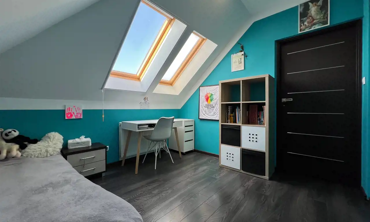 - Okna PCV, w dwóch sypialniach na piętrze wyposażone w elektryczne rolety zewnętrzne