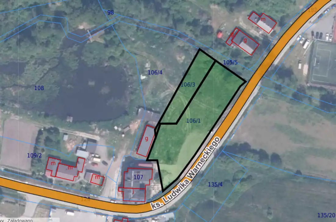 - Działka nie posiada bezpośredniego dostępu do drogi publicznej, dojazd do ul. Ks. Ludwika Waryńskiego odbywa się przez działkę 106/1.