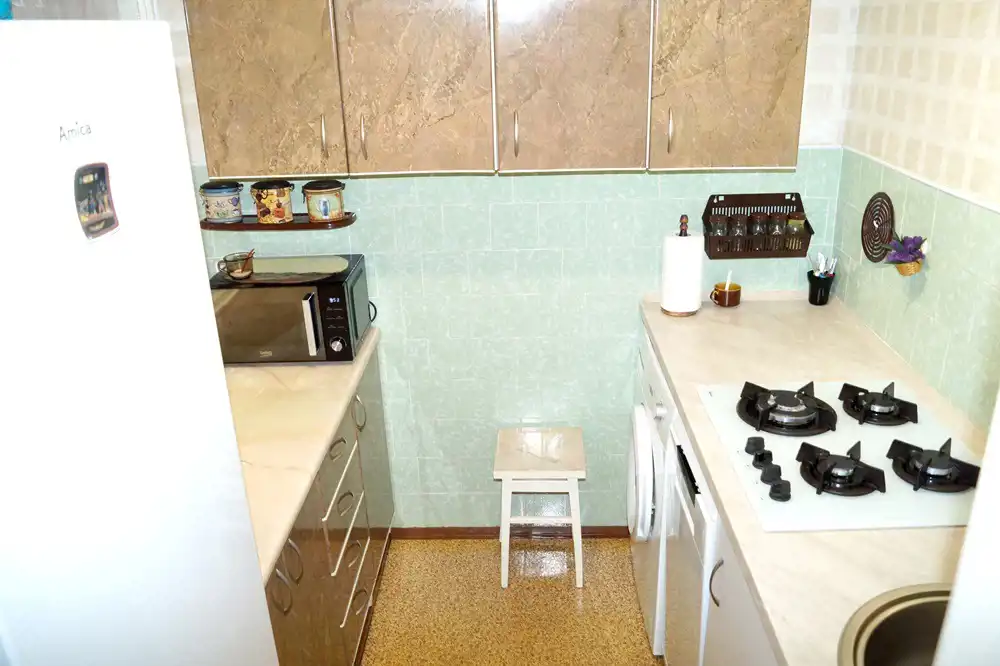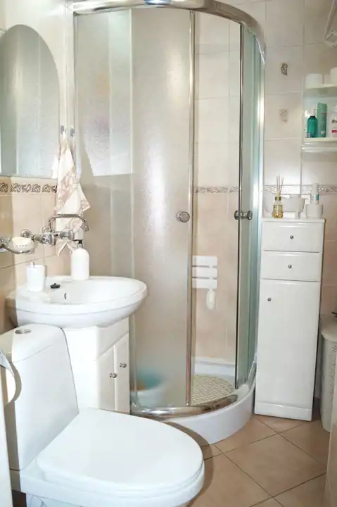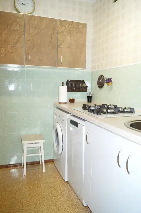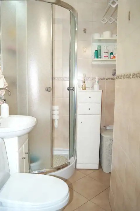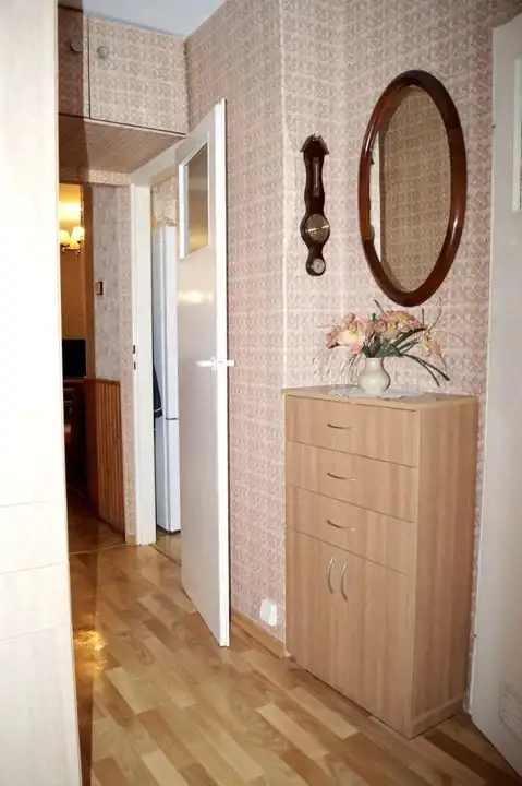 Kuchnia jest w pełni wyposażona w meble kuchenne wraz ze sprzętem AGD, w tym płytę gazową, zmywarkę i lodówkę. Łazienka posiada kabinę prysznicową, umywalkę z szafką oraz meble łazienkowe. W przedpokoju znajduje się duża szafa w zabudowie.W salonie i pokojach na ścianach położona jest tapeta na podłodze parkiet. Łazienka w płytkach.