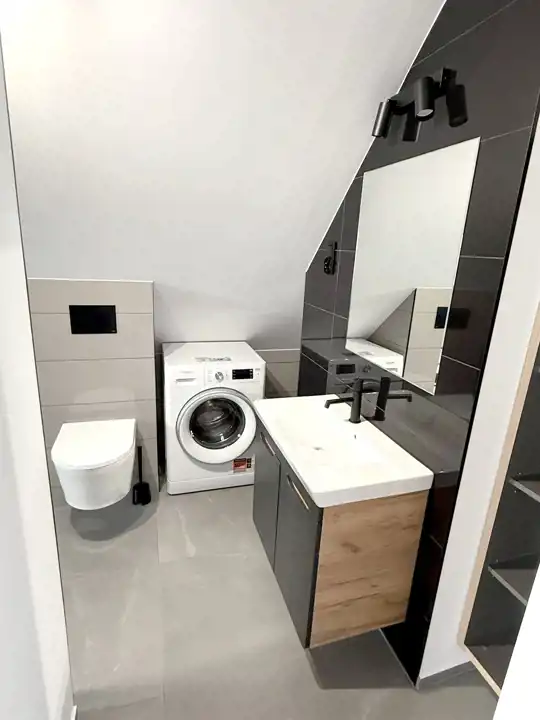 Mieszkanie w pełni umeblowane i wyposażone . W salonie znajduje się rozkładany narożnik , stolik , szafa pod telewizor/ komoda oraz duża szafa z lustrem . W sypialniach łóżka , biuro , komoda, szafka nocna . Kuchnia wyposażona w nowoczesną zabudowę kuchenną , lodówkę , kuchenkę elektryczną , piekarnik, zmywarkę oraz stolik z krzesłami . W łazience pralka.