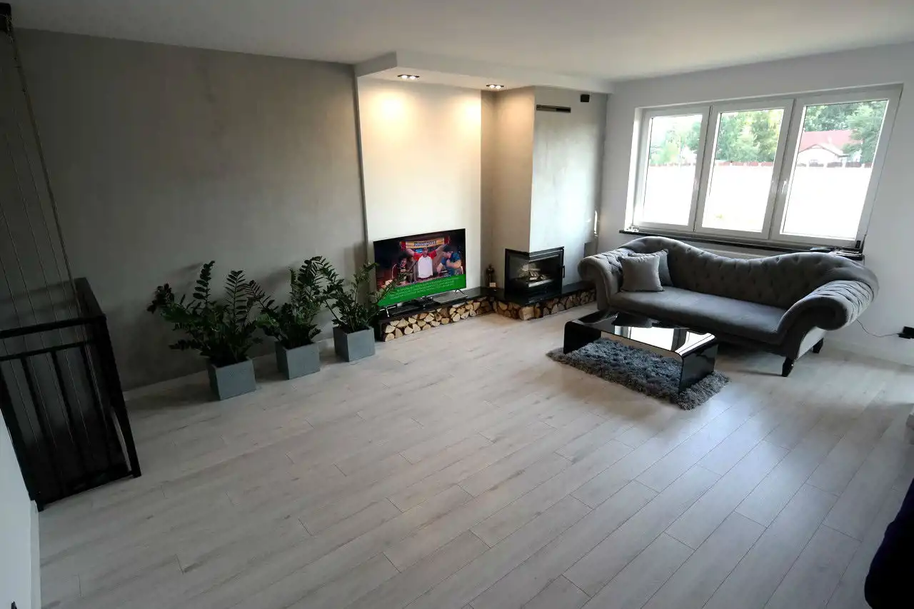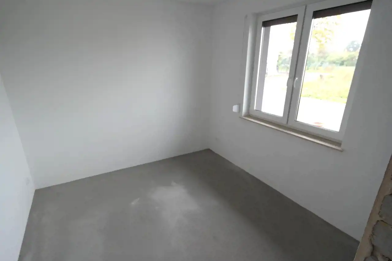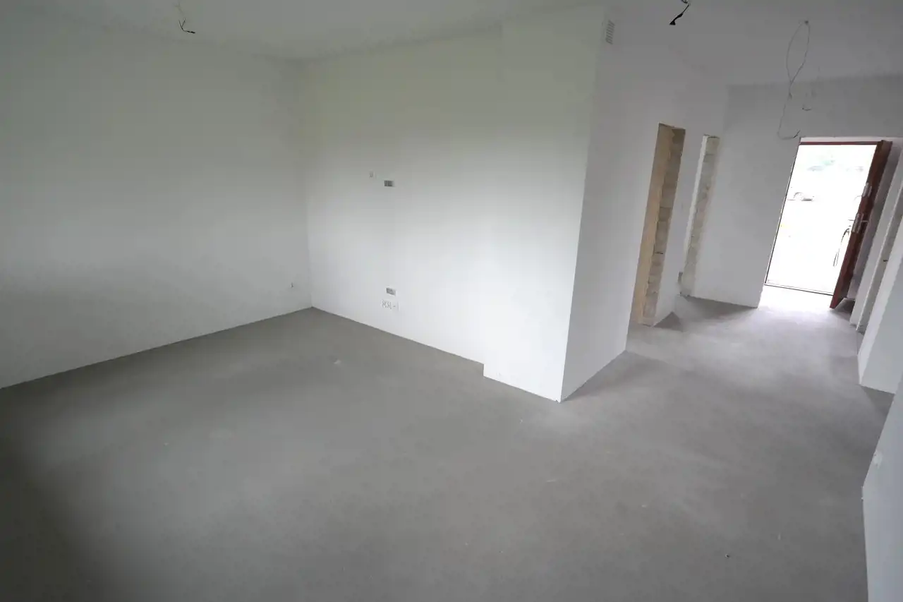 Nowe mieszkanie. Stan deweloperski. Z dużym potencjałem. Jedno poziomowy. Docieplony styropianem i wełną mineralną 20 cm. Poddasze nieużytkowe. Okna PCV 3 szybowe. Duży taras z widokiem na ogródek. W pokojach wylewki betonowe. Gładzie na ścianach. Aneks kuchenny połączony z salonem, łazienka z WC do aranżacji. Drzwi antywłamaniowe. Duży salon z aneksem i wyjściem na taras. Miejsce na kominek. Dwie lub trzy sypialnie. Miejsce parkingowe przed domem. Działka ok 800 m2 z ogródkiem. Część zdjęć przykładowych aranżacji.
