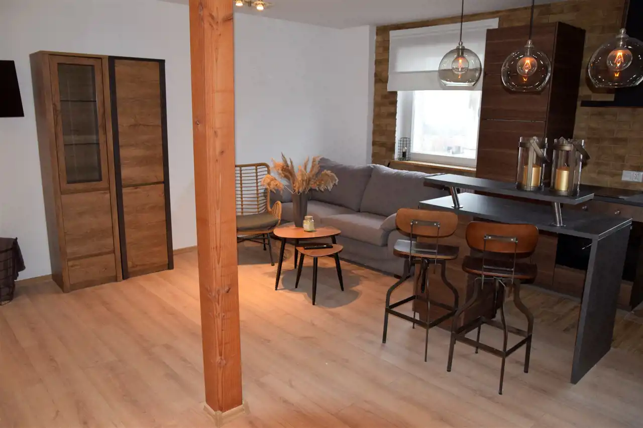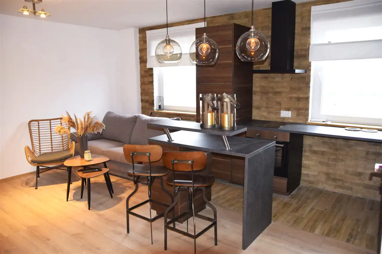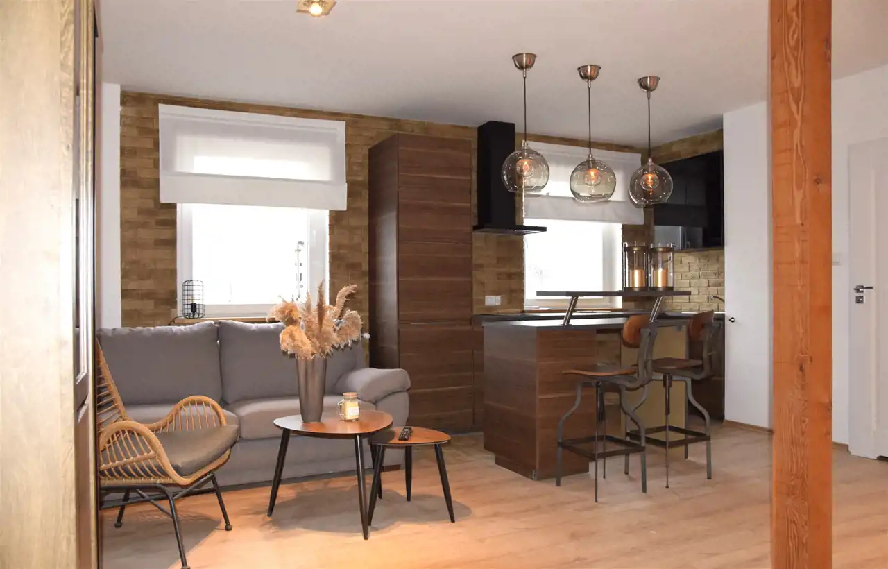 - Przestronny, jasny pokój dzienny, połączony z nowoczesnym aneksem kuchennym, częścią wypoczynkową, jadalnią oraz wydzieloną częścią sypialnianą. Mieszkanie urządzone jest w eleganckim stylu, wykorzystując ciemne drewno oraz brązową cegłę, co nadaje mu ciepły, drewniany charakter..