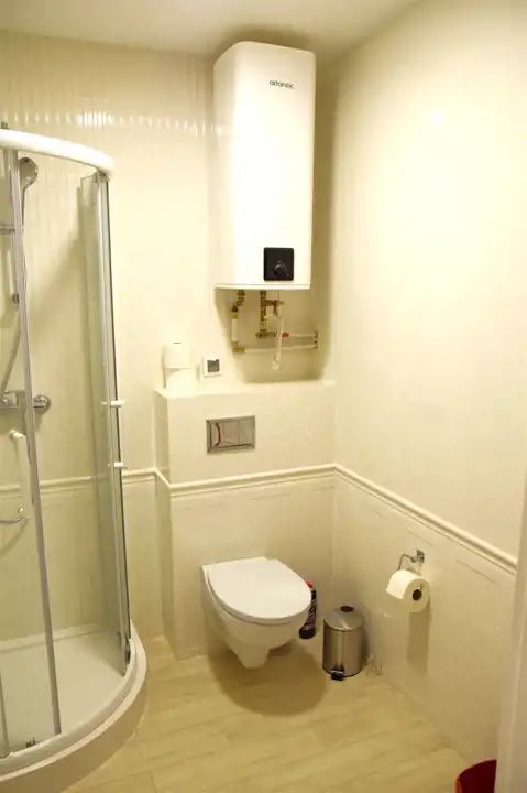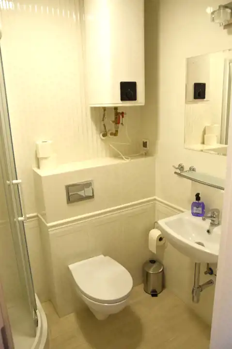 - Łazienka: W pełni wyposażona, z kabiną prysznicową, umywalką i WC – nowoczesna i praktyczna.