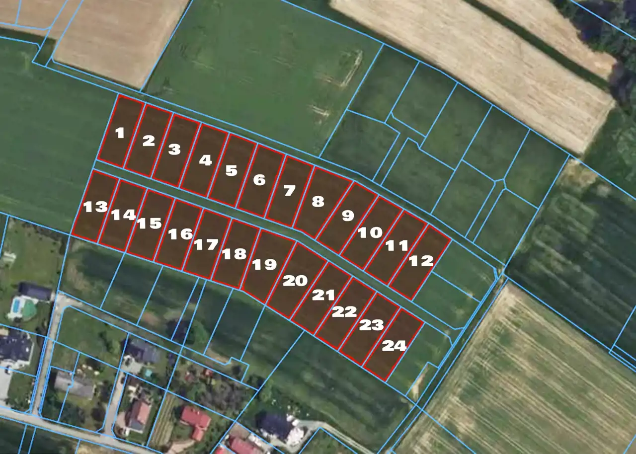 Na sprzedaż 24 działki budowlane o powierzchni od 803-937m2 zlokalizowane w Międzyrzeczu Dolnym przy ul.Porzeczkowej.