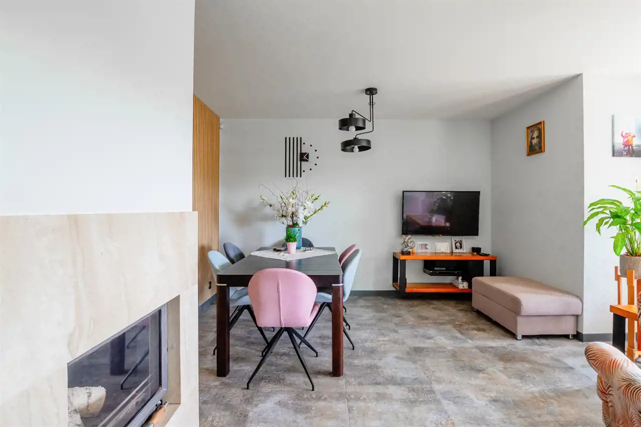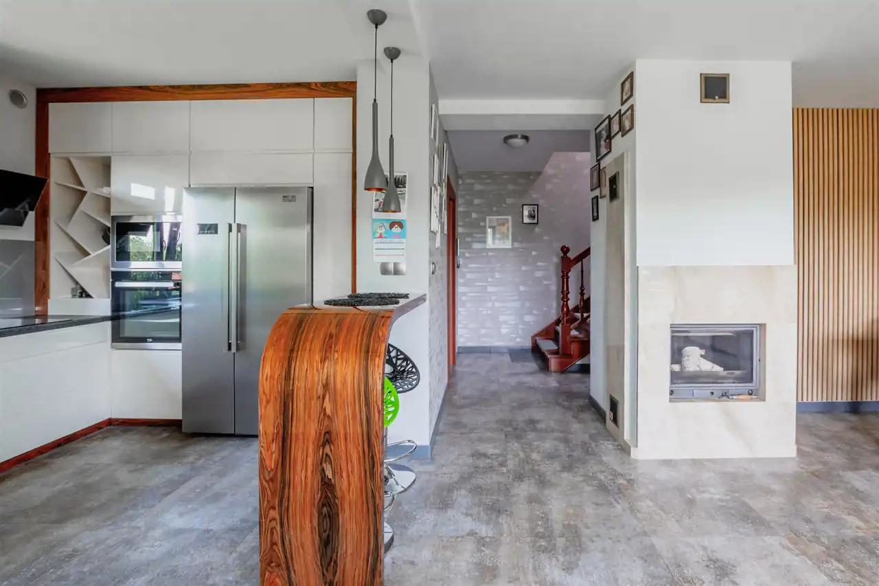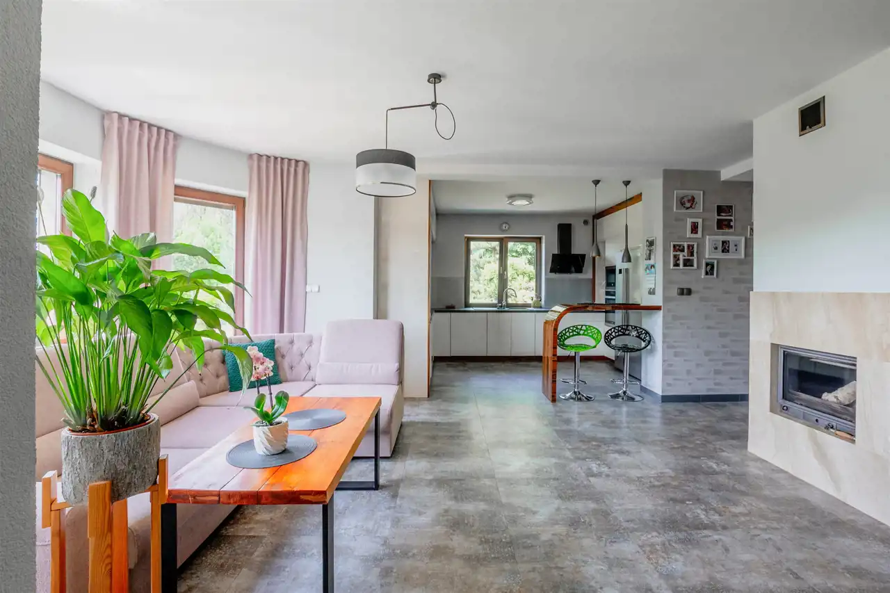 Przestronny salon z kominkiem i systemem rozprowadzania ciepła