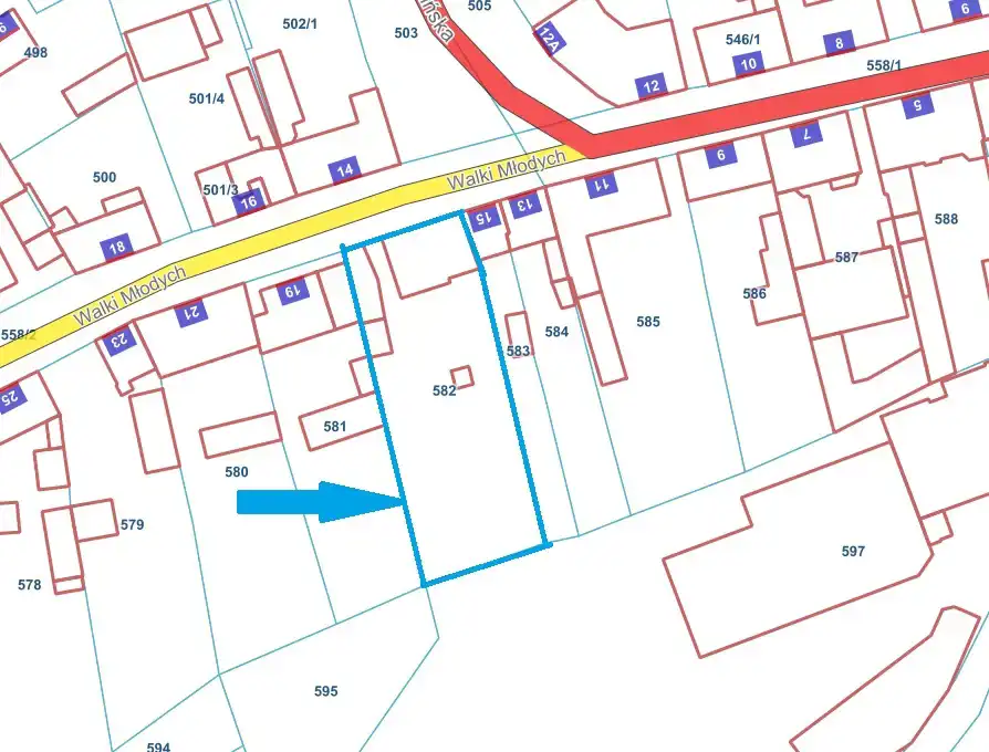 Działka niezabudowana, położona bezpośrednio przy ul. Walki Młodych, dojazd asfaltowy, chodnik przy granicy działki.