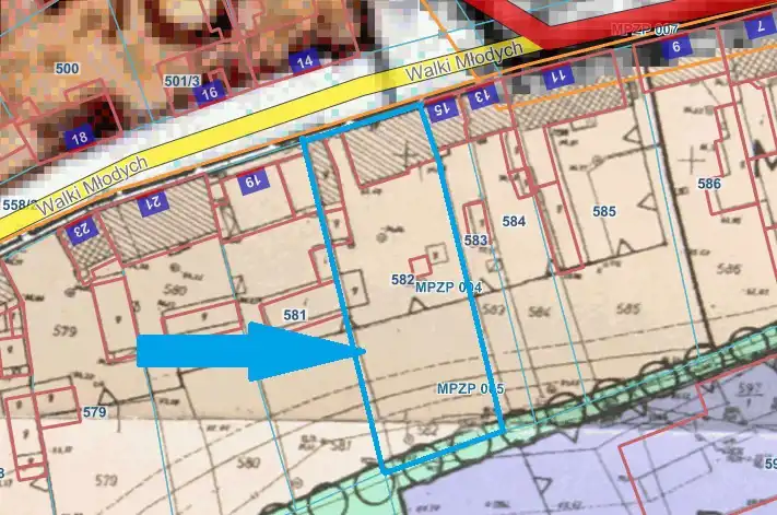 - obowiązująca linia zabudowy jest przy granicy z ulicą Walki Młodych