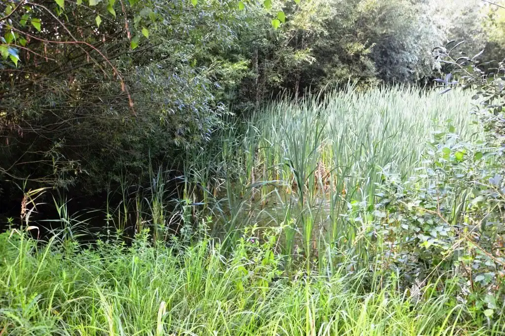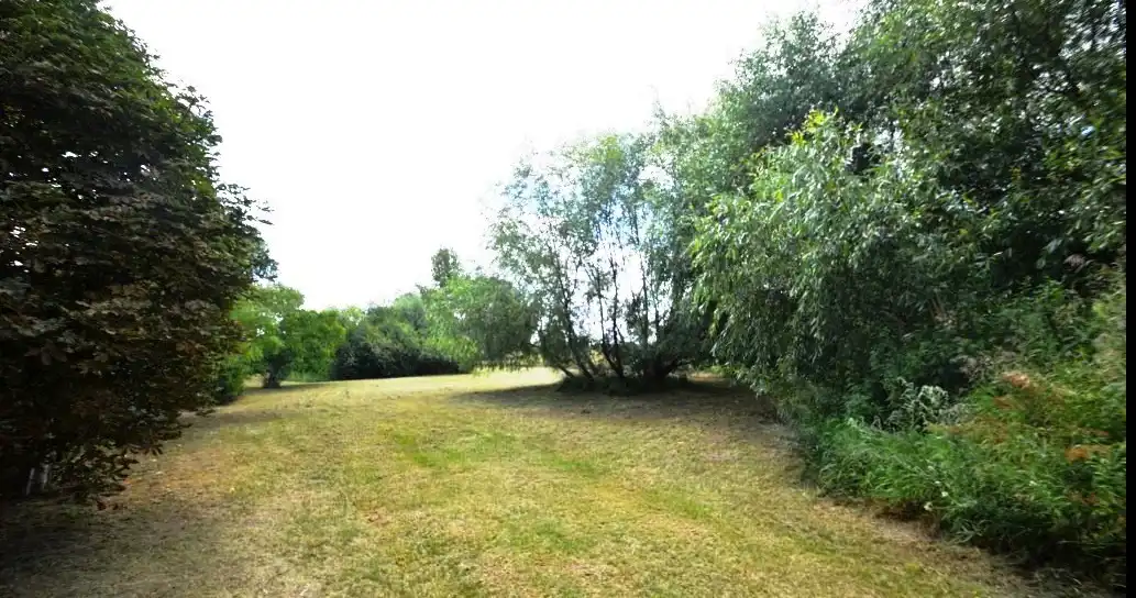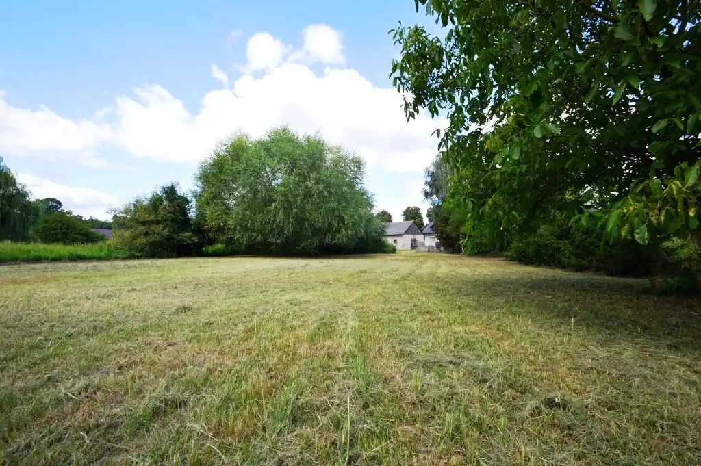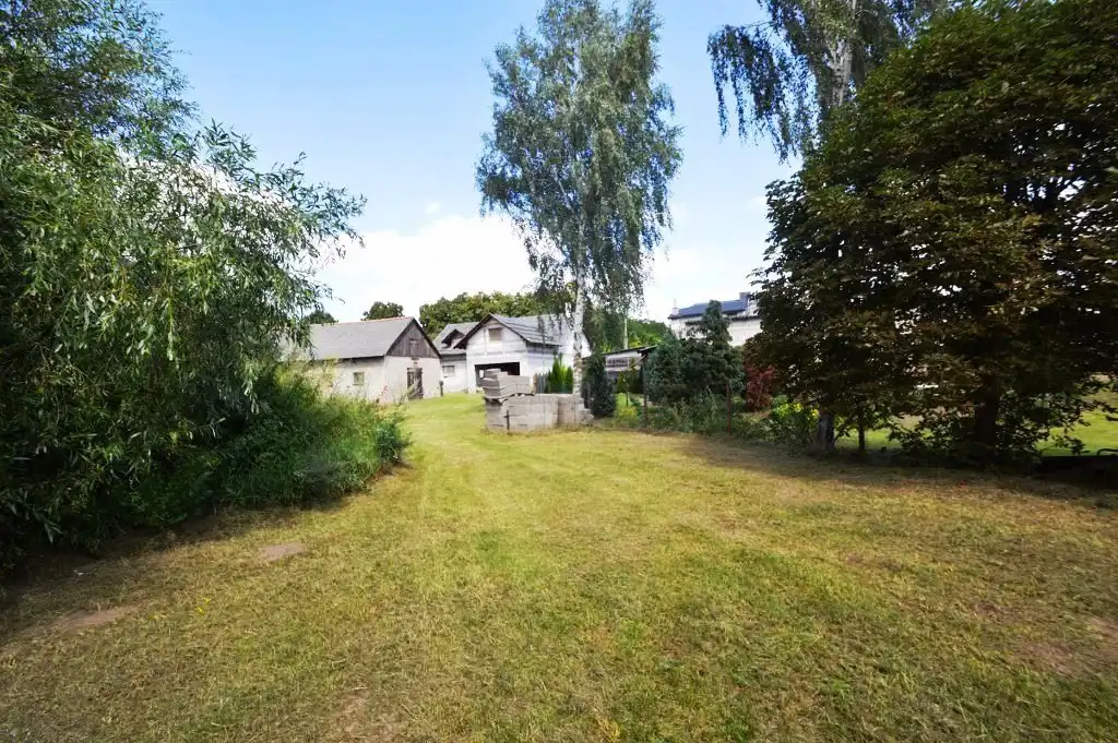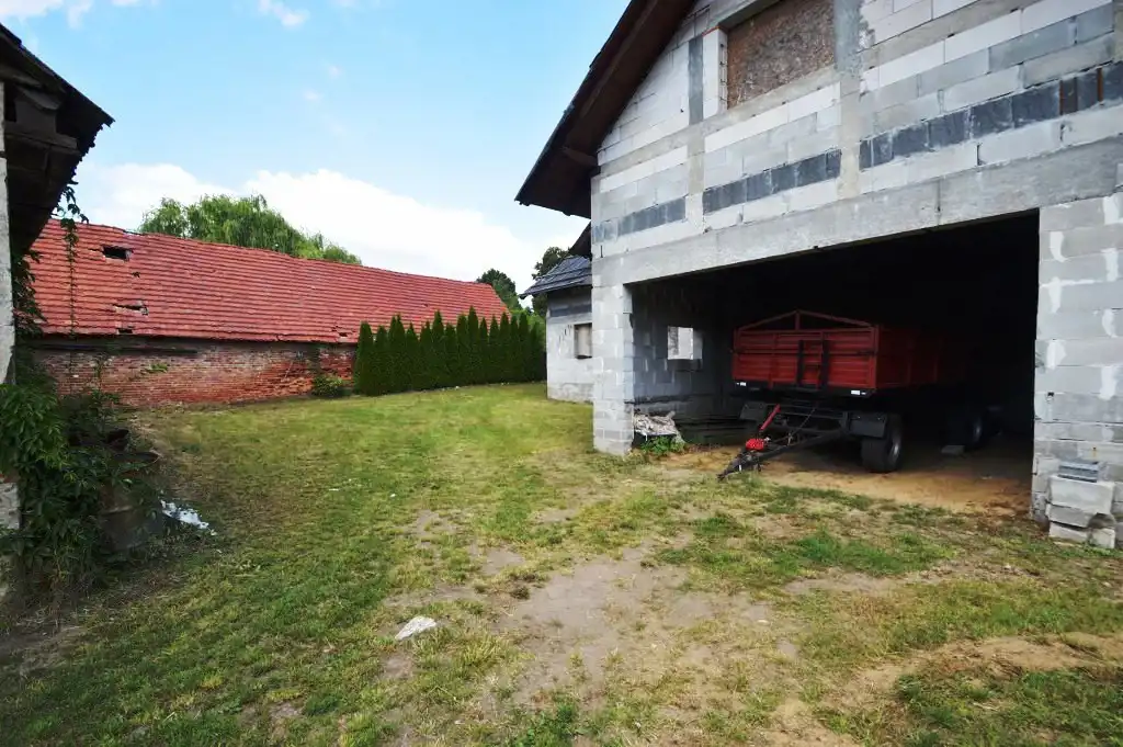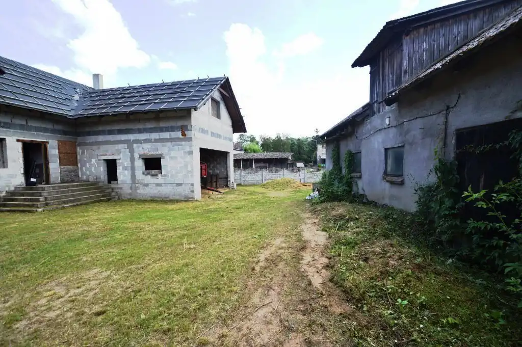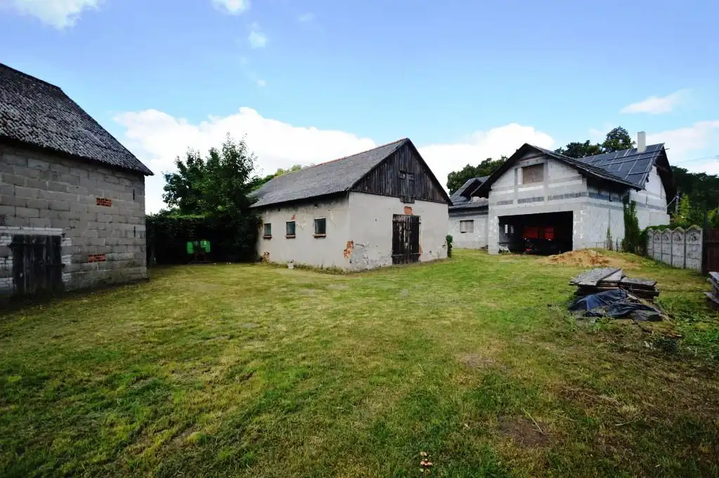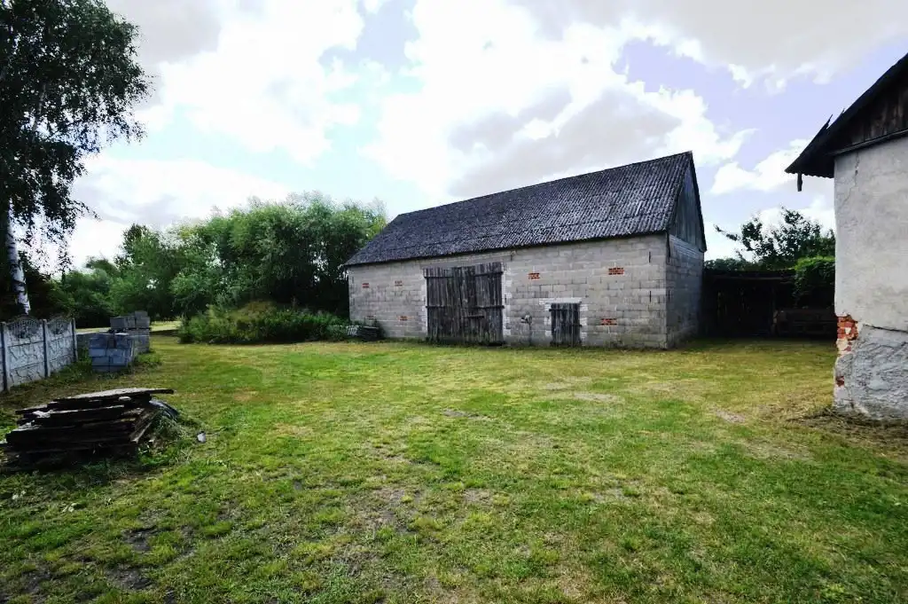 Za domem znajdują się dwa murowane budynki gospodarcze oraz mały staw.