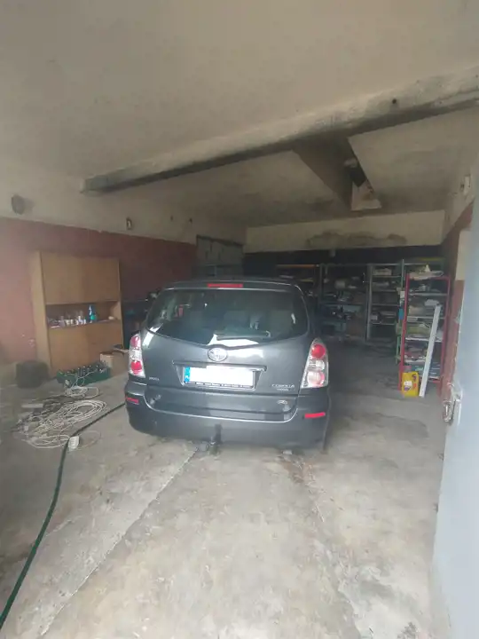Garaż w bryle budynku z 2 pomieszczeniami gospodarczymi.