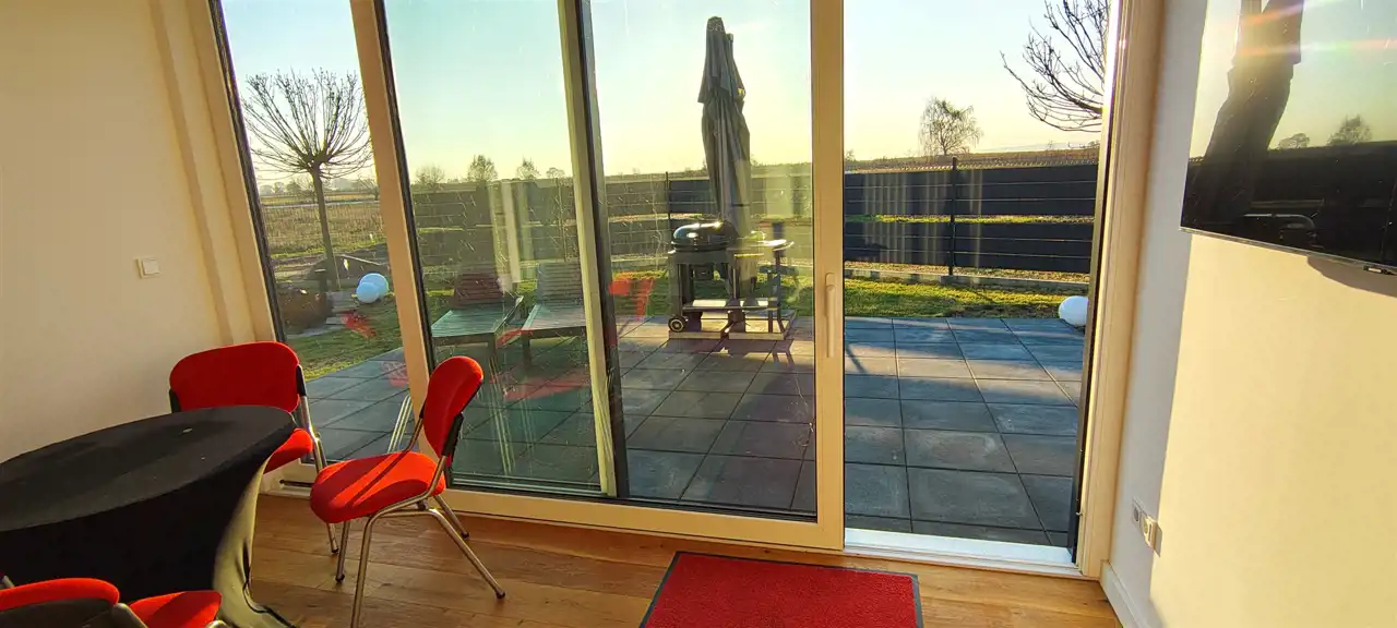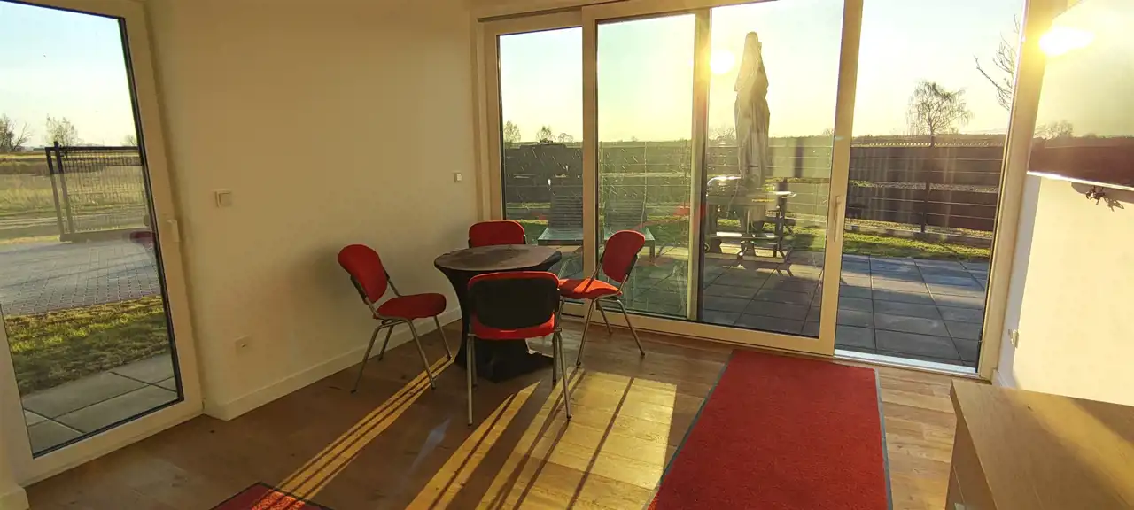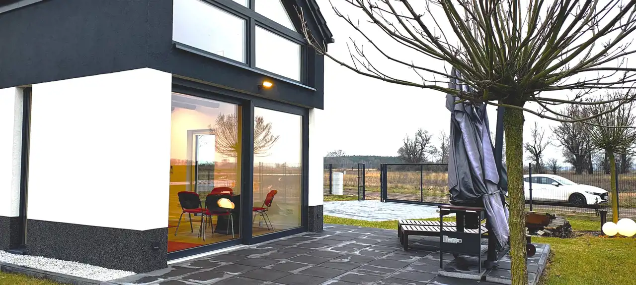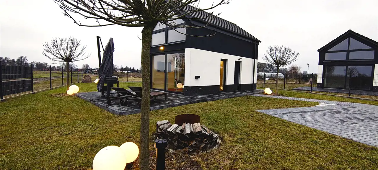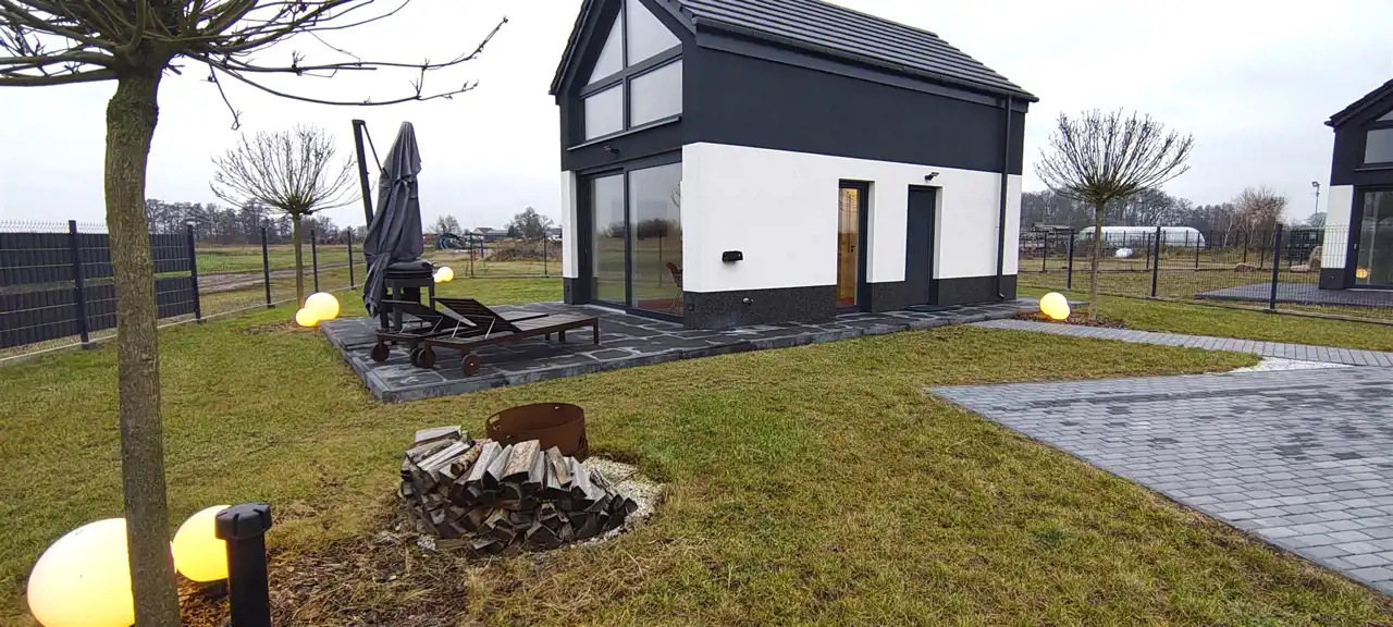 DOM z ogrodem do zamieszkania od zaraz PROMOCJA CENOWA do końca grudnia 2025 r ! Możliwość dokupienia nieruchomości gruntowej przyległej do domku. Gwarantowana jakość materiałów. Prosta nowoczesna bryła kryta dwuspadowym dachem, duże przeszklenie całej ściany elewacyjnej zakończone słonecznym tarasem.Widok z okien na zachodnią stronę - wprost na jezioro i Szczecin po drugiej stronie.