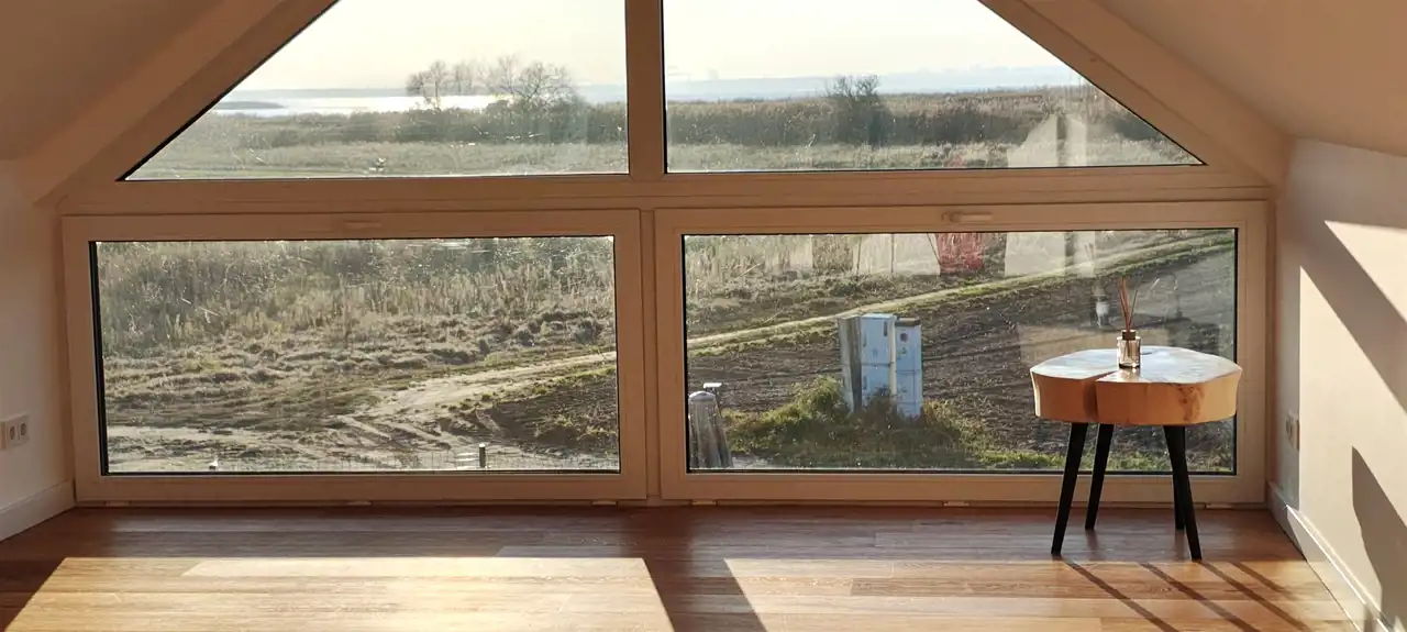 Salon o powierzchni 25 m2 z wyjściem na taras, pokój na piętrze 25 m2 z widokiem na Zalew Szczeciński.