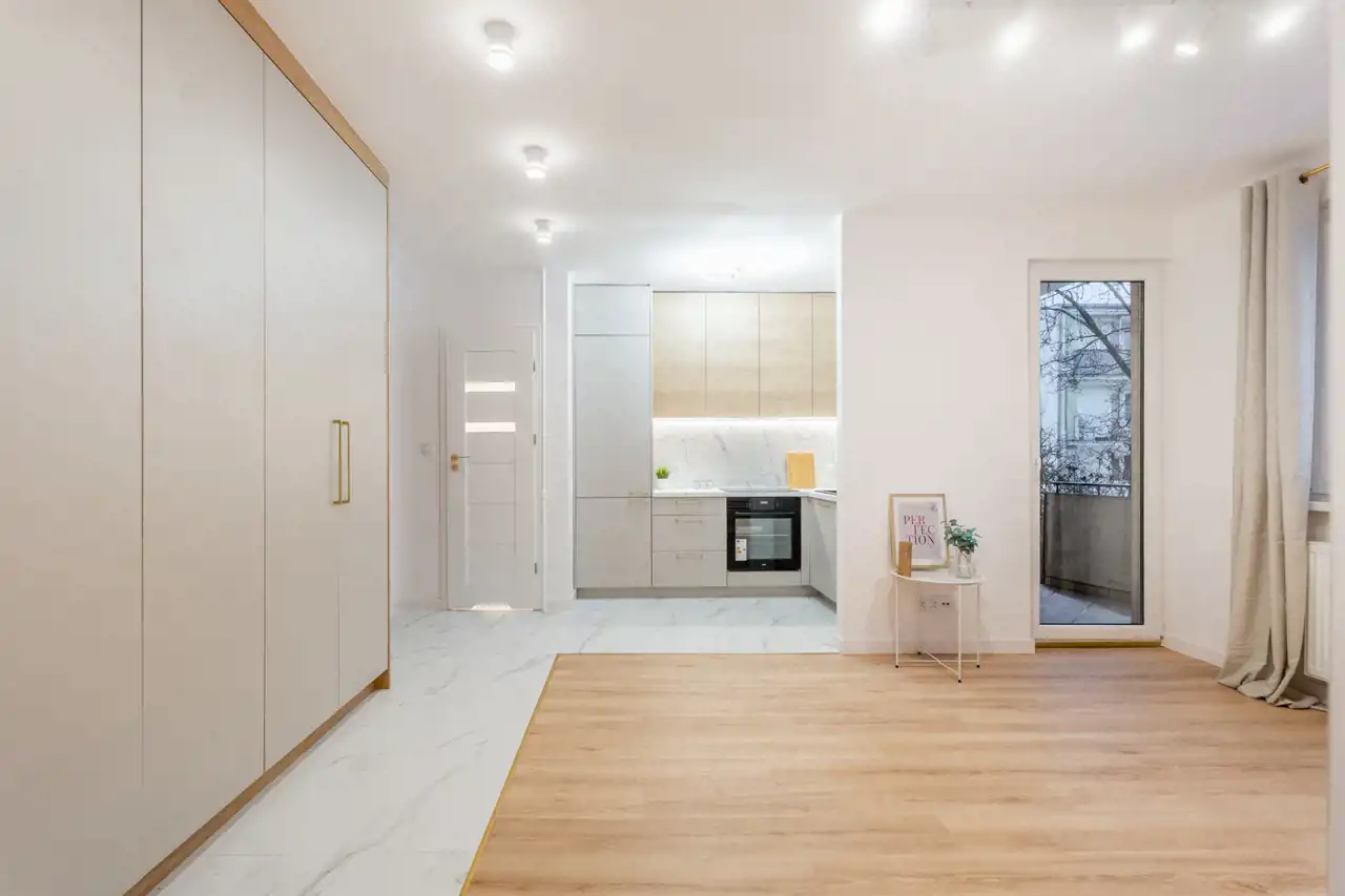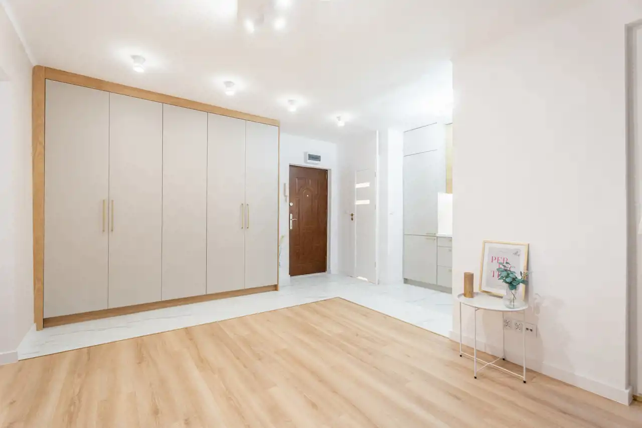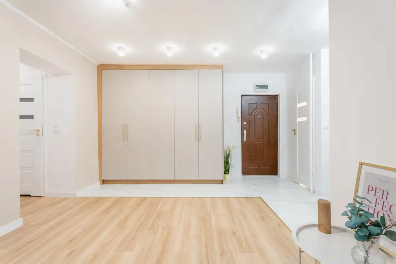 Całość aranżacji mieszkania jest spójna, jasna, z wykorzystaniem dobrych materiałów wykończeniowych.