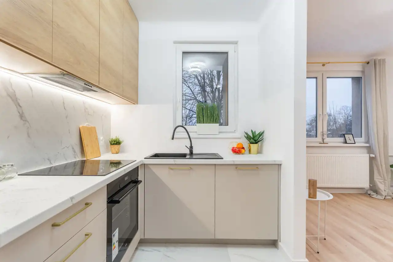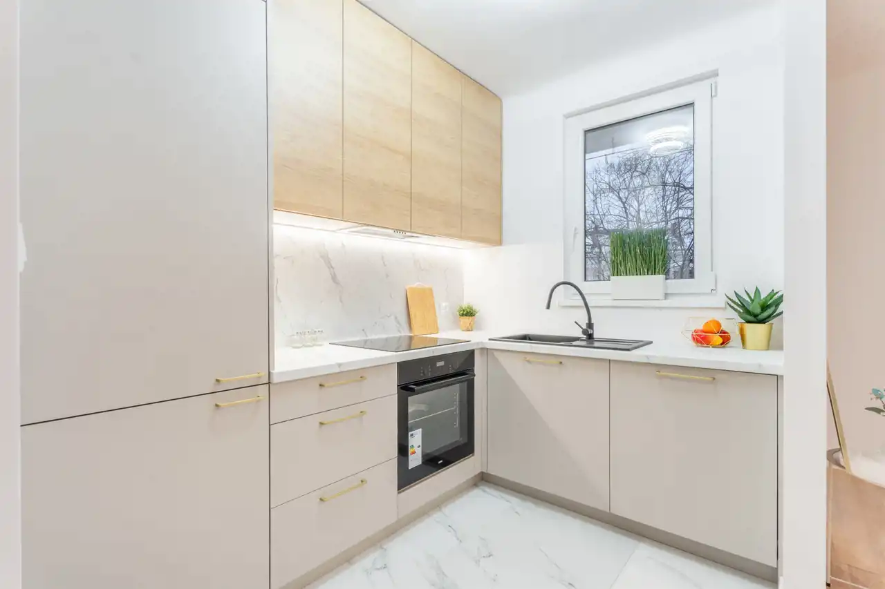 Kuchnia w pełni wyposażona w nowe sprzęty AGD, dobrze doświetlona ze względu na ekspozycję okien,