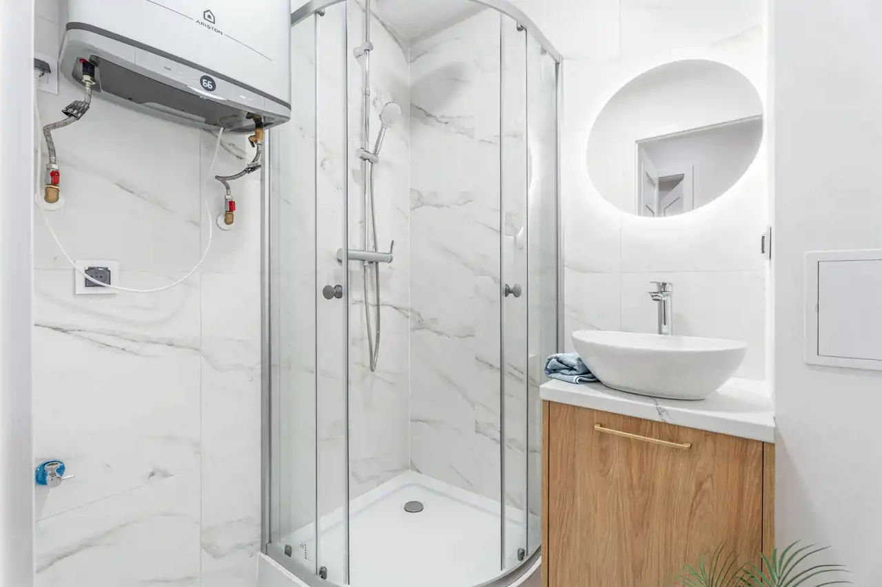 Łazienka w pełni wyposażona, ładny gres, ceramika, armatura, oświetlenie, dbałość o najmniejsze detale.