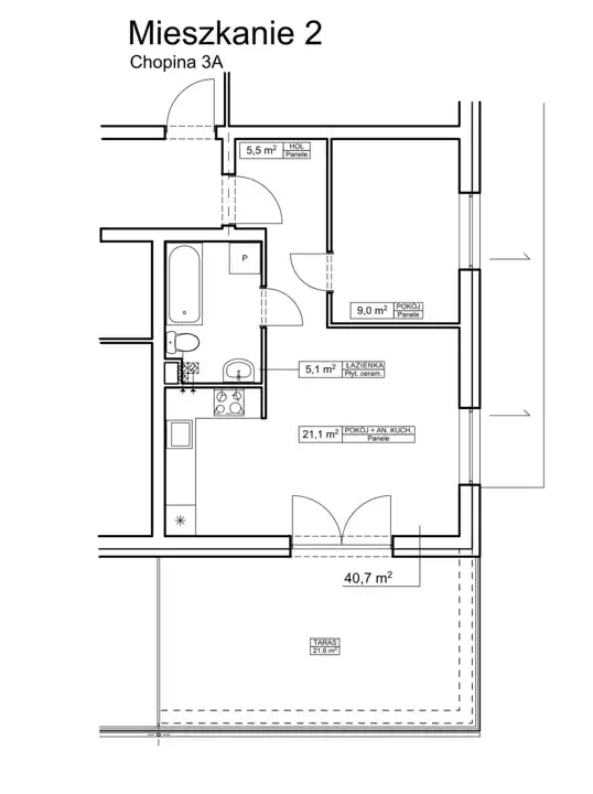 - Pokój dzienny z aneksem kuchennym (21,1 m²) z wyjściem na duży taras – przestronna i jasna część dzienna,