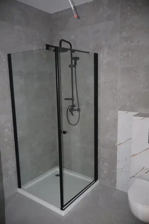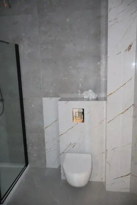 Łazienka wykończona w nowoczesnym design'ie przy użyciu wysokiej jakości płytek ceramicznych, kabiny prysznicowej oraz sedesu.