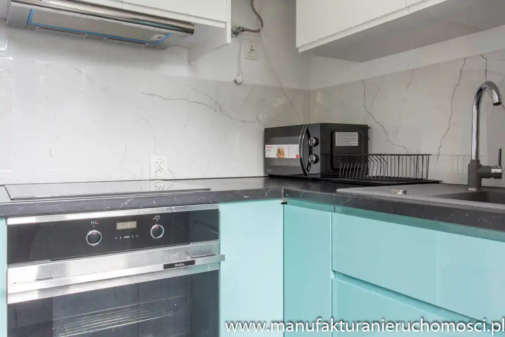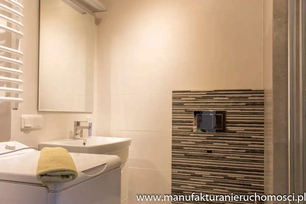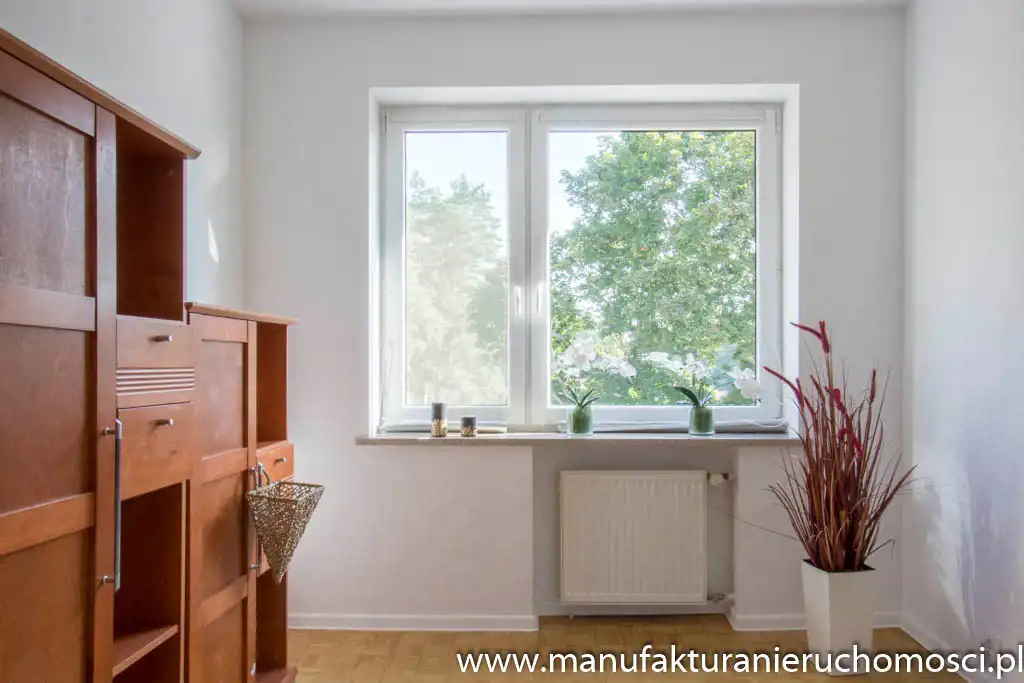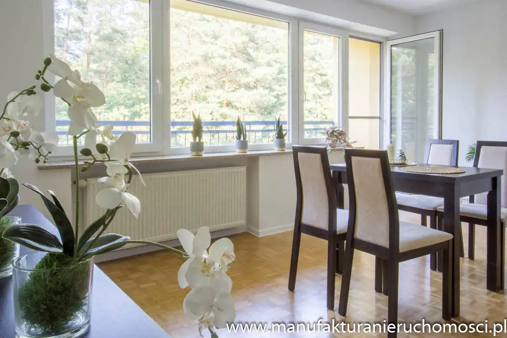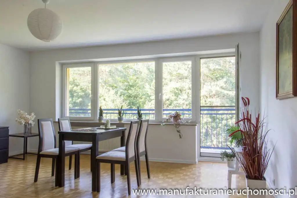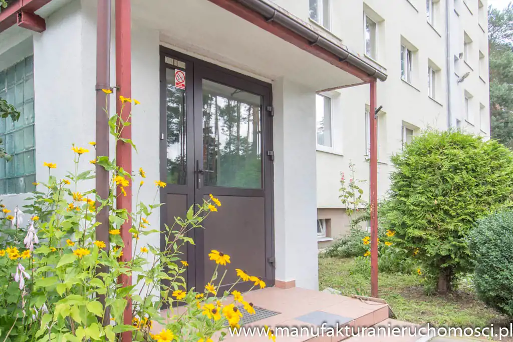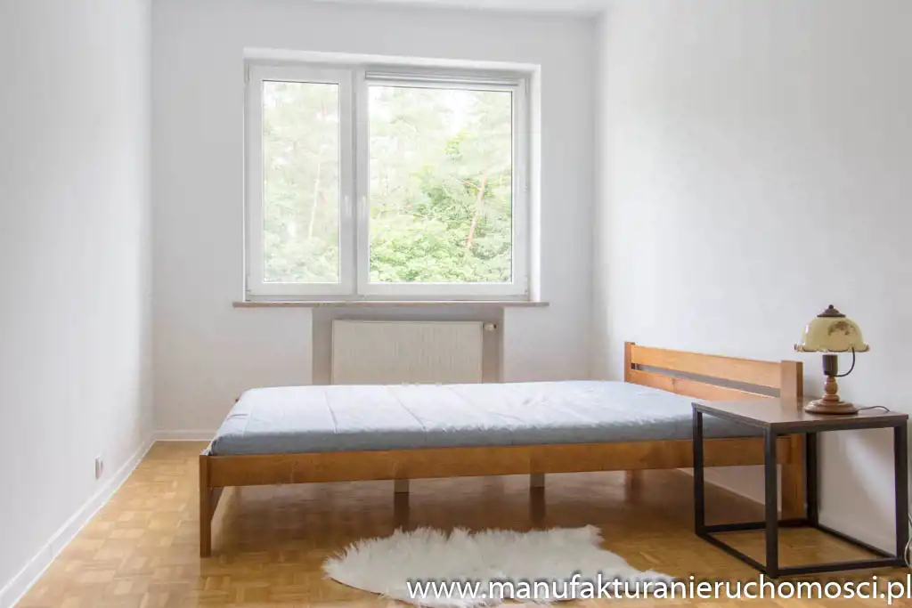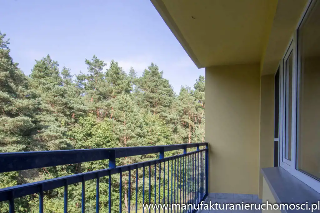 Powierzchnię mieszkalną (61 m2) stanowi przestronny salon z wyjściem na balkon (z widokiem na las), dwie sypialnie, osobna w pełni wyposażona kuchnia oraz łazienka z prysznicem i wc.
