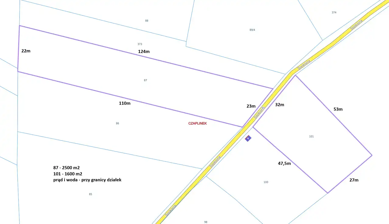 - Media Woda: w ulicy; Kanalizacja: brak; Prąd: w ulicy; Gaz: brak