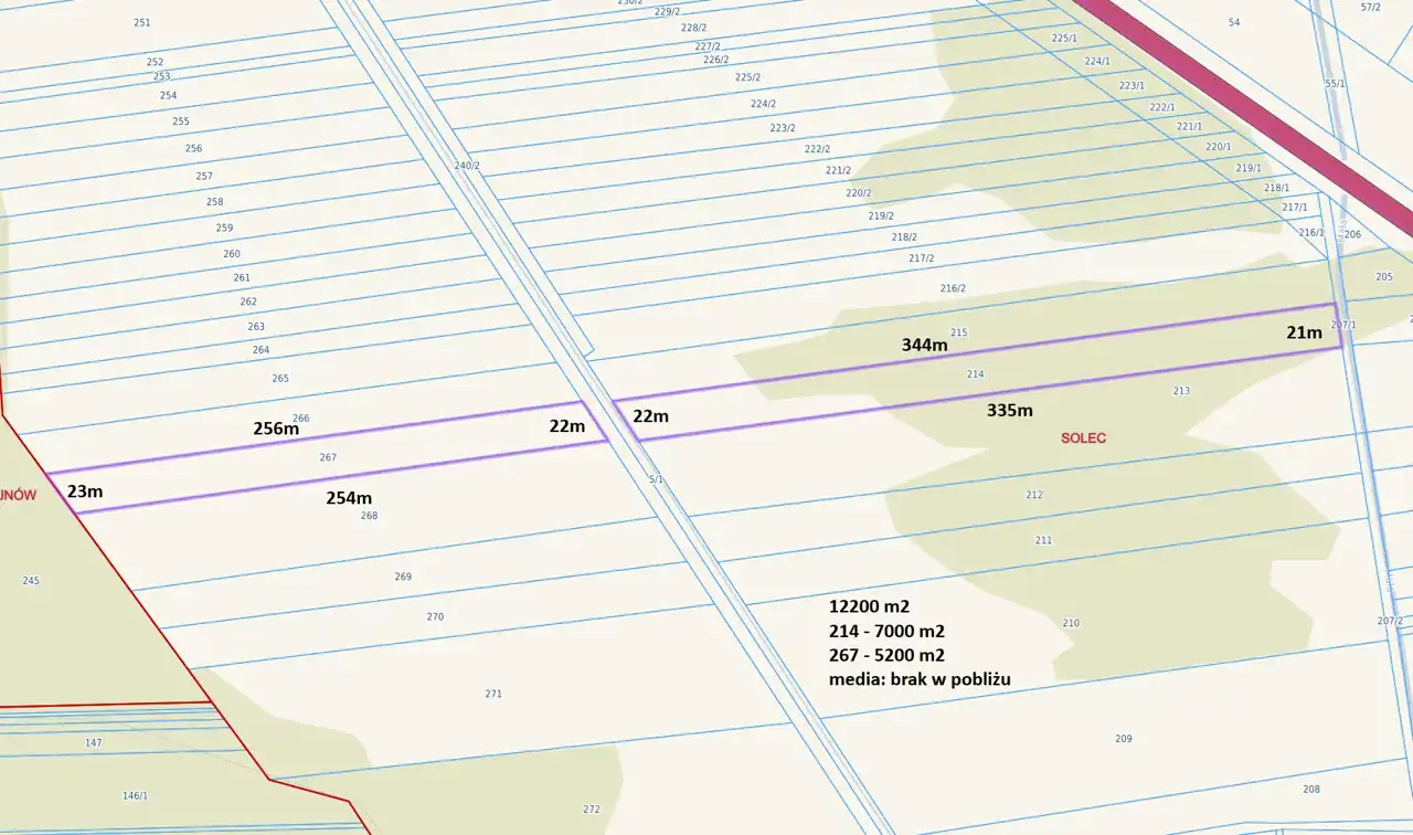- Media Woda: brak; Kanalizacja: brak; Prąd: brak; Gaz: brak