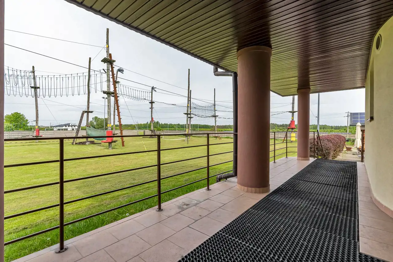 Na terenie (sąsiednia działka-nie zawiera się w cenie sprzedaży, istnieje możliwość dzierżawy) znajduje się pełnowymiarowe (68m x 105m) profesjonalne boisko trawiaste do gry w piłkę nożną, a także: szatnie z natryskami oraz magazynek na sprzęt sportowy. Boisko spełnia najbardziej rygorystyczne wymogi stawiane przez międzynarodowe standardy FIFA. Boisko posiada odpowiedni drenaż uniemożliwiający pojawienie się wody na murawie boiska.