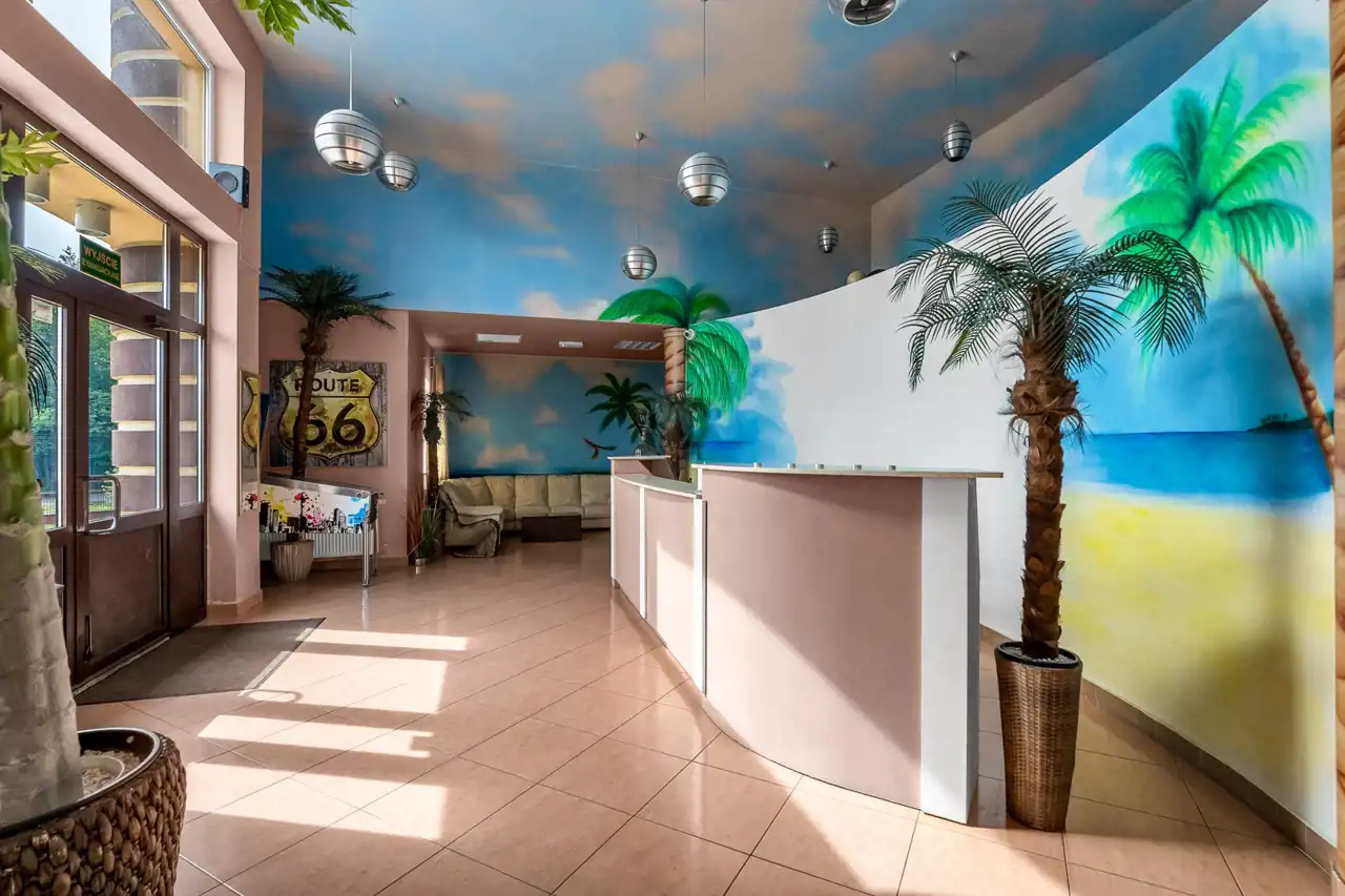 Część hotelowa budynku znajduje się na parterze. Ośrodek dysponuje 18 pokojami 2-osobowymi oraz 2 apartamentami o wyższym standardzie wykończenia. Każdy pokój wyposażony jest w łazienkę, telewizor, dostęp do internetu.