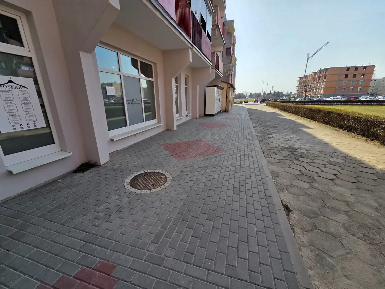 Miejsce na reklamę: szyld na elewacji i duże witryny wystawowe.