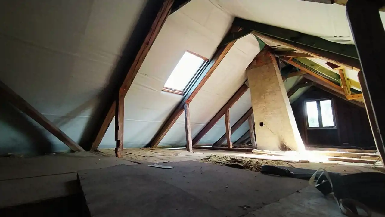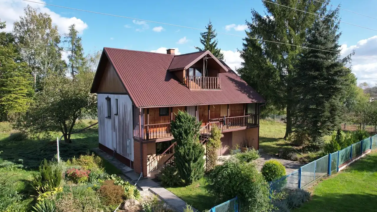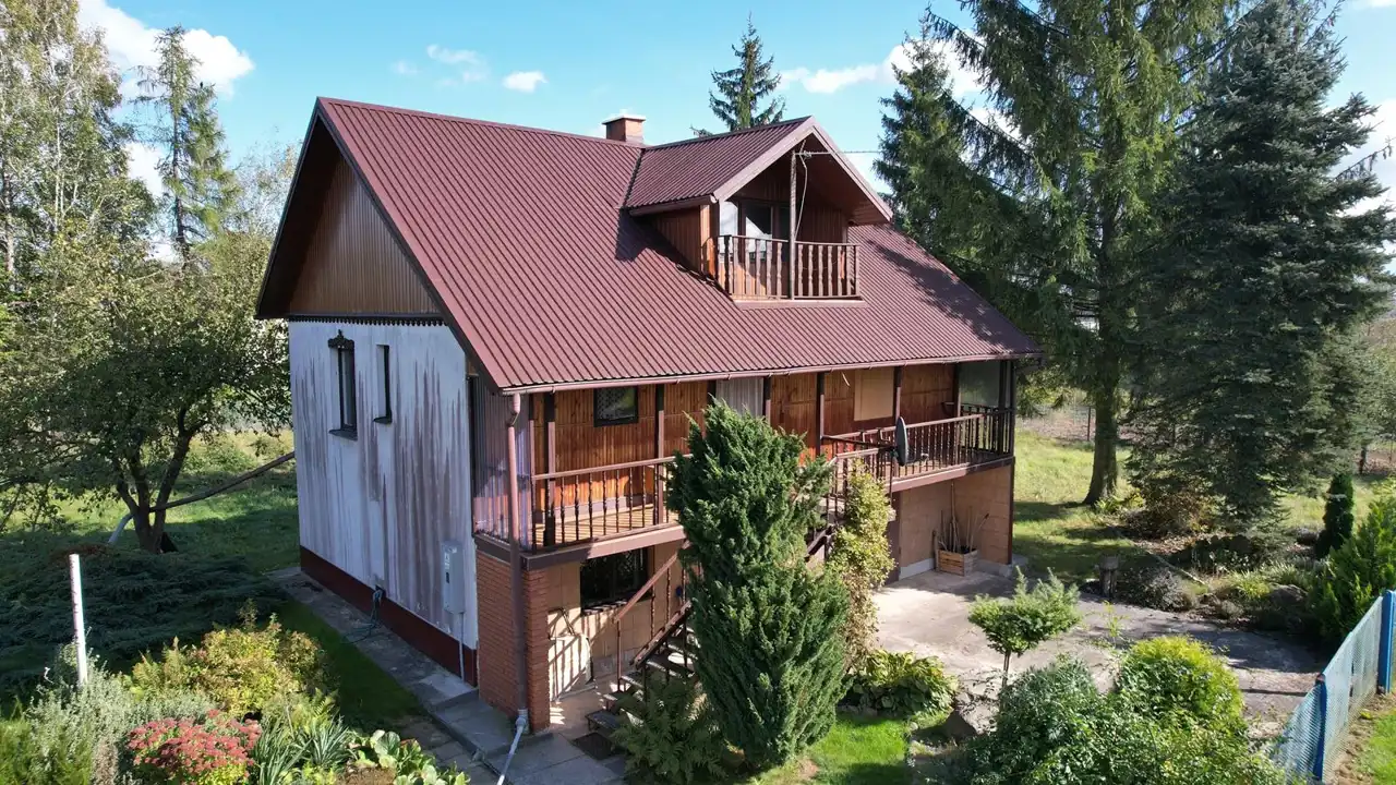 dach kryty blachą, okna drewniane, budynek docieplony styropianem,
