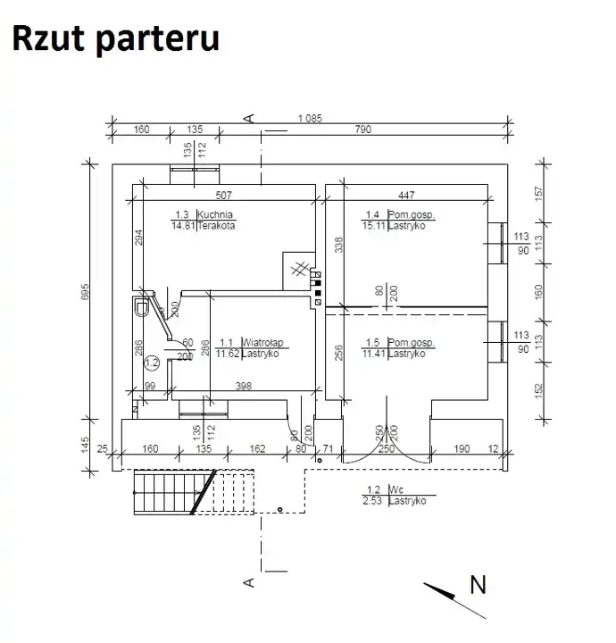 * parter: kuchnia, 3 pomieszczenia gospodarcze , WC,