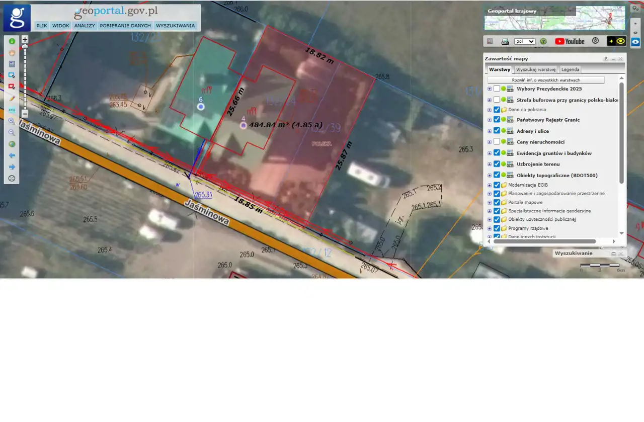 Wymiary działki ok.: 18,5 (szer. od frontu) x 25,5 [m].