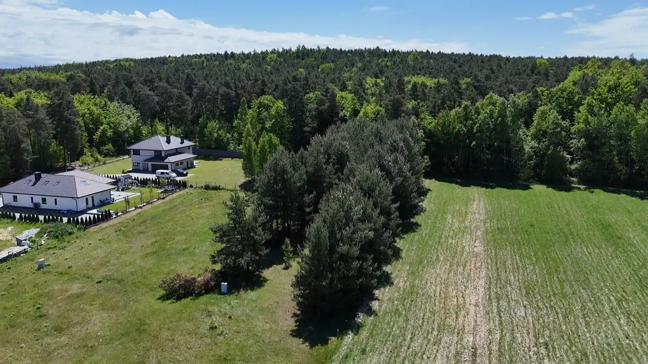 Działka w kształcie prostokąta, płaska i usytuowana nieopodal lasu.